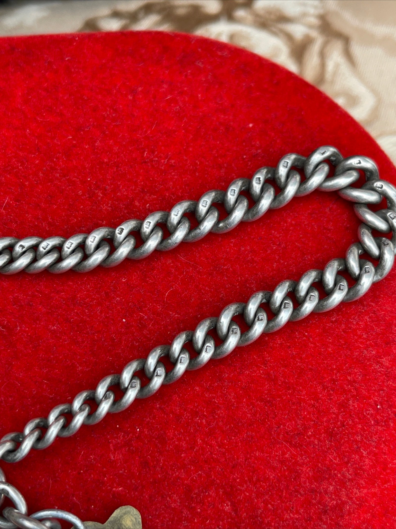 A rare and sought after Georgian double watch chain crafted from solid silver. Sympathetically cleaned to retain it’s antique charm. Exceptionally high quality with each link bearing a makers stamp. Versatile styling options with the example of being worn as a necklace presented here. Other pieces in the final styled image are available in separate listings but not included in this sale. ERA: Georgian, year 1788 MEASUREMENTS: TBC Weight: Heavy 63g MATERIALS: Solid Sterling Silver HALLMARKS: Fully hallmarked and each link individually marked for the year 1788 with S S makers mark. CONDITION: Very Good B+ This beautiful piece has been kept in excellent condition for over 200 years. It is free from significant scratches or significant distortions. One lobster clasp is functional but loose so may require attention or replacement upon preference. |