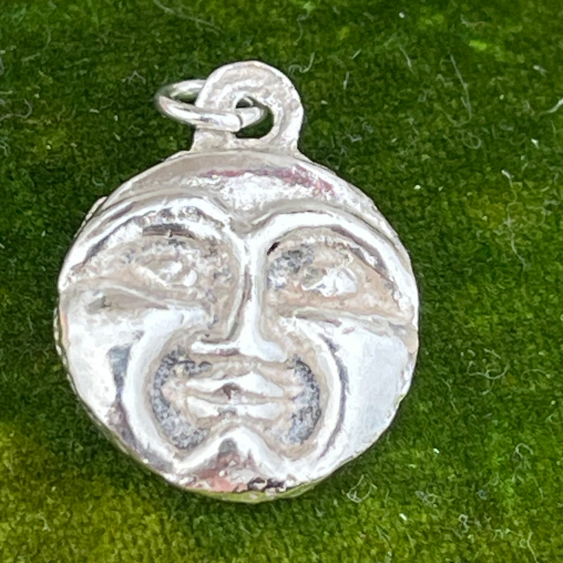 A sterling silver moon & stars charm, intricately detailed three dimensional design and double sided. Can be worn as a pendant or affixed to a bracelet as a charm.