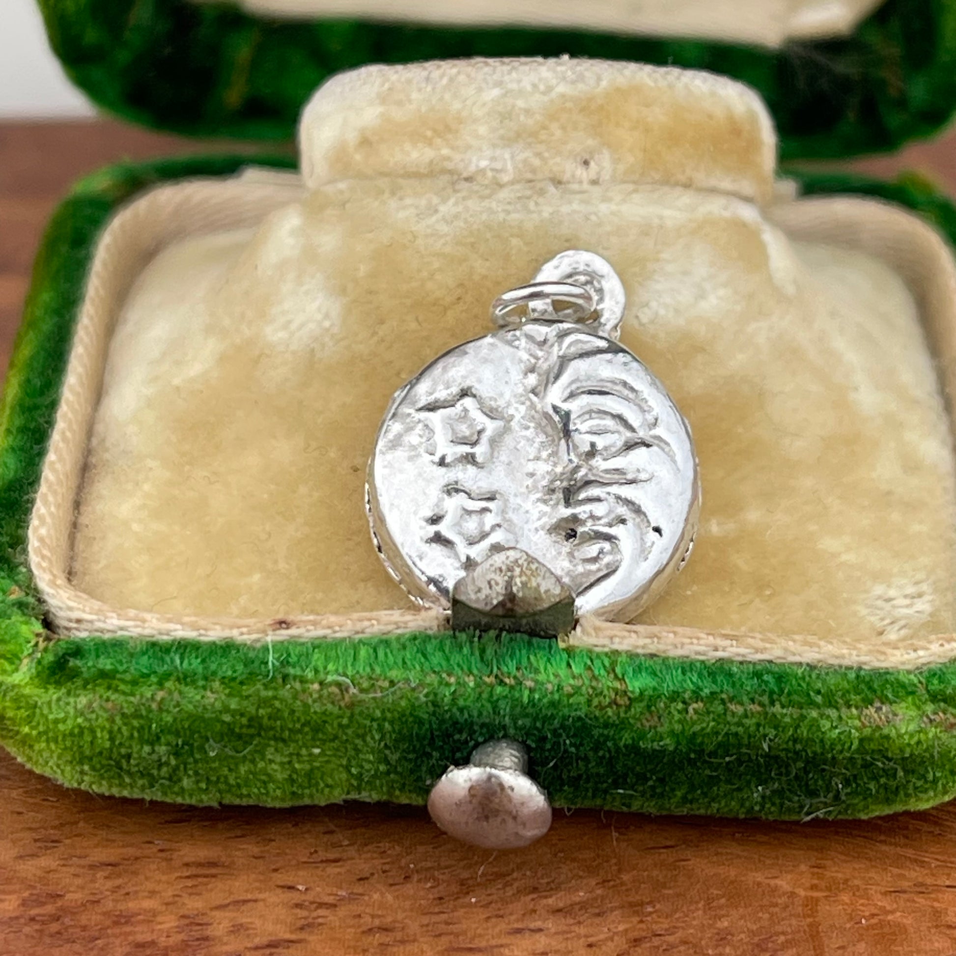 Old Vintage Sterling Silver Moon Face & Stars 3d Double Sided Charm Pendant
