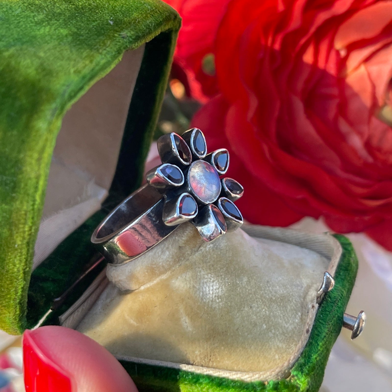 Sterling Silver Moonstone Amethyst Garnet Crystal Flower Ring