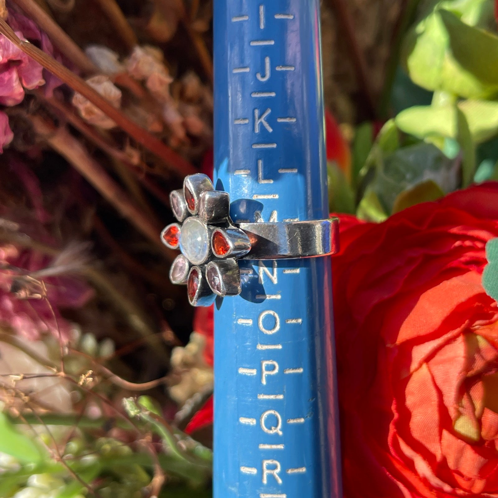 Sterling Silver Moonstone Amethyst Garnet Crystal Flower Ring M