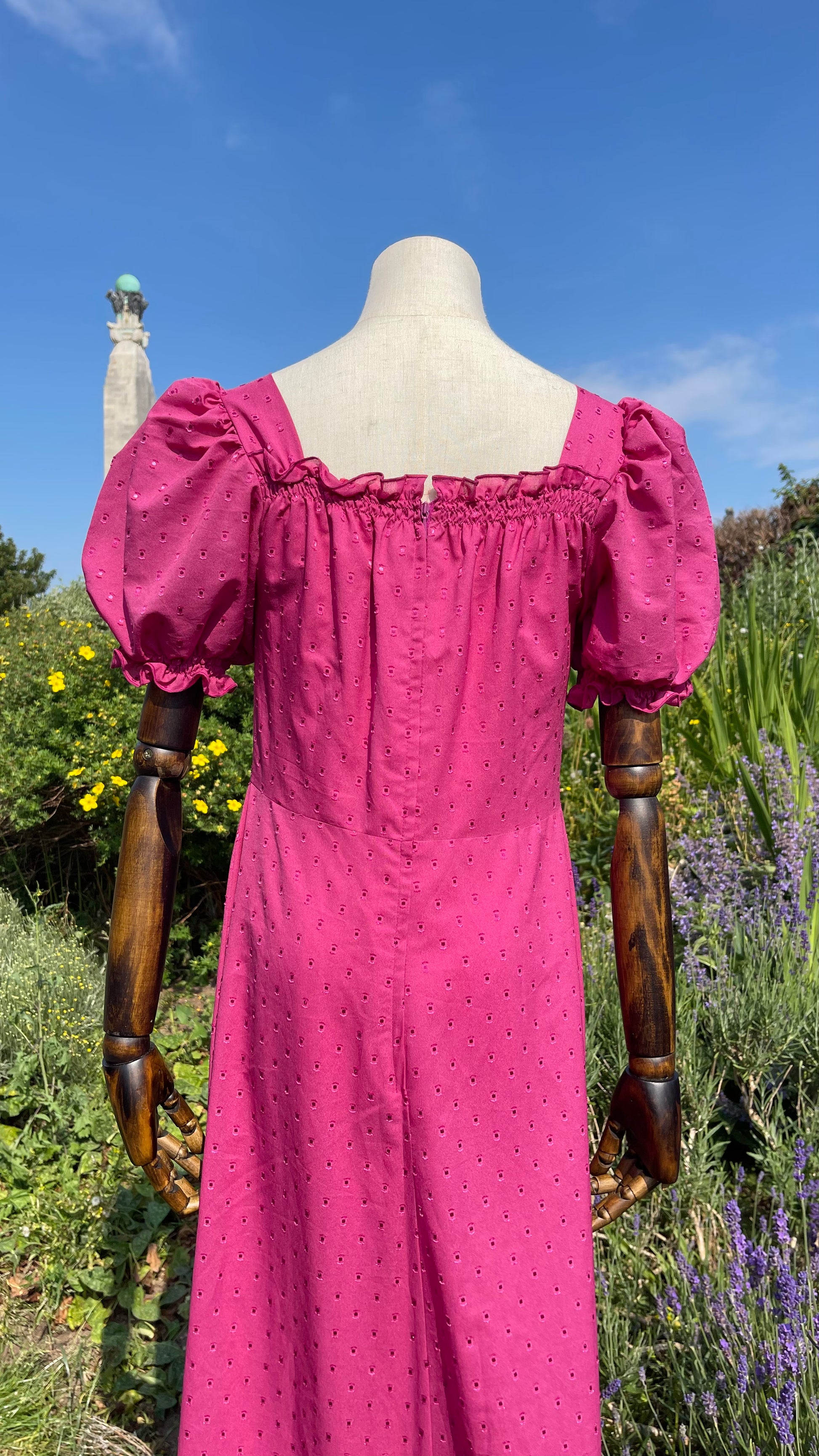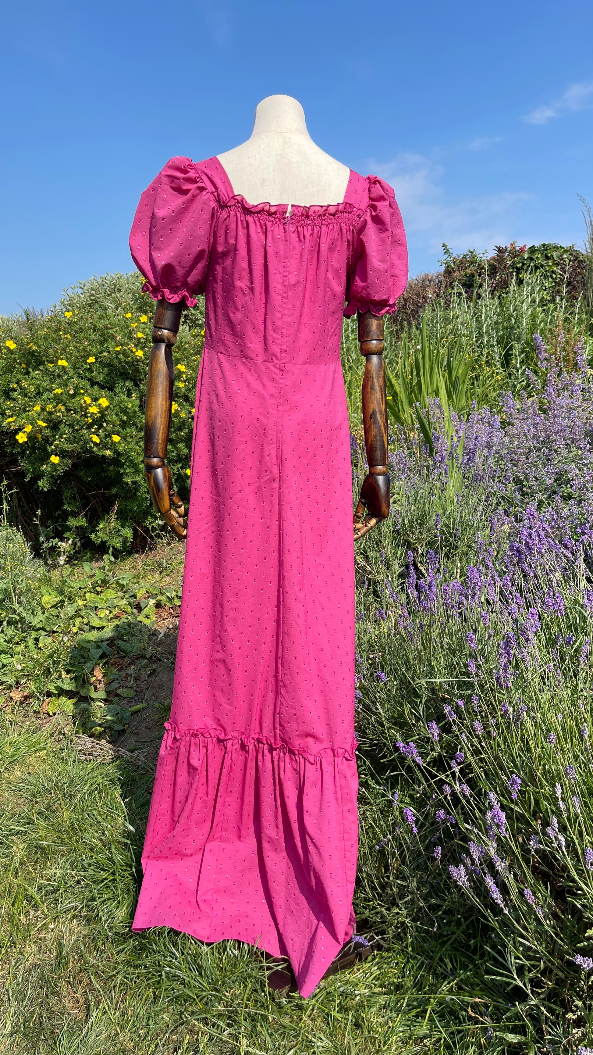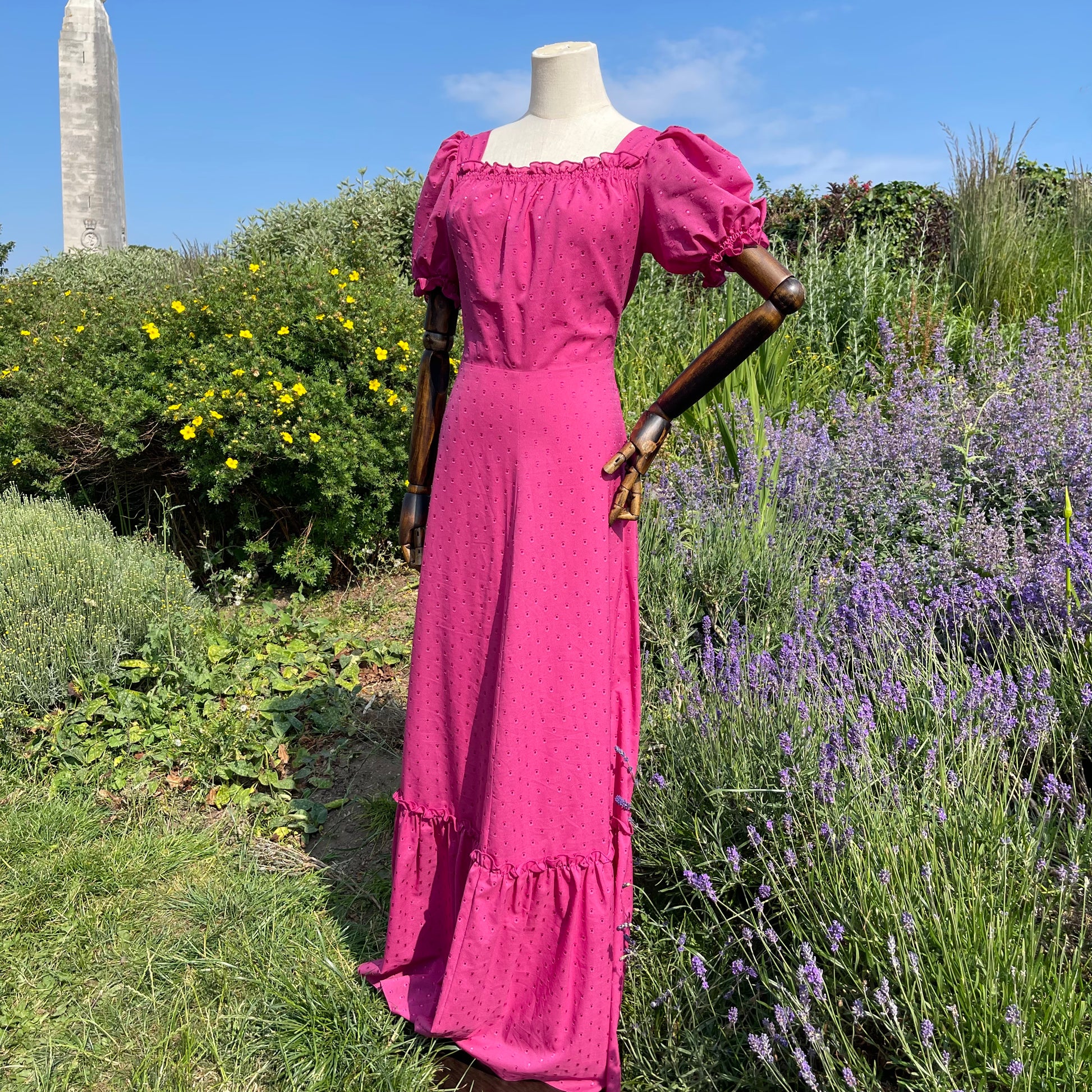 Vintage 1970s peasant ruffle puff sleeve maxi dress in magenta pink