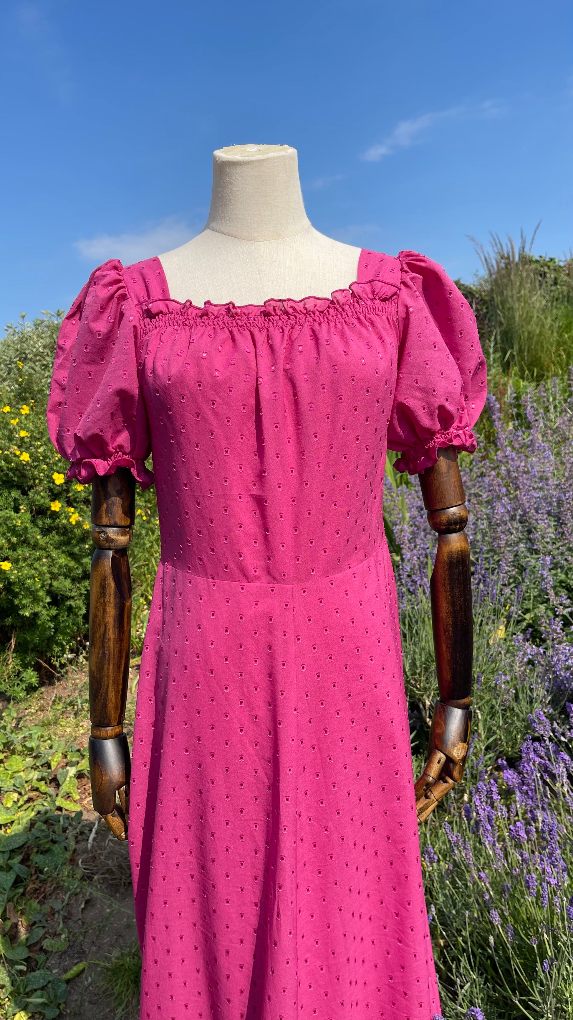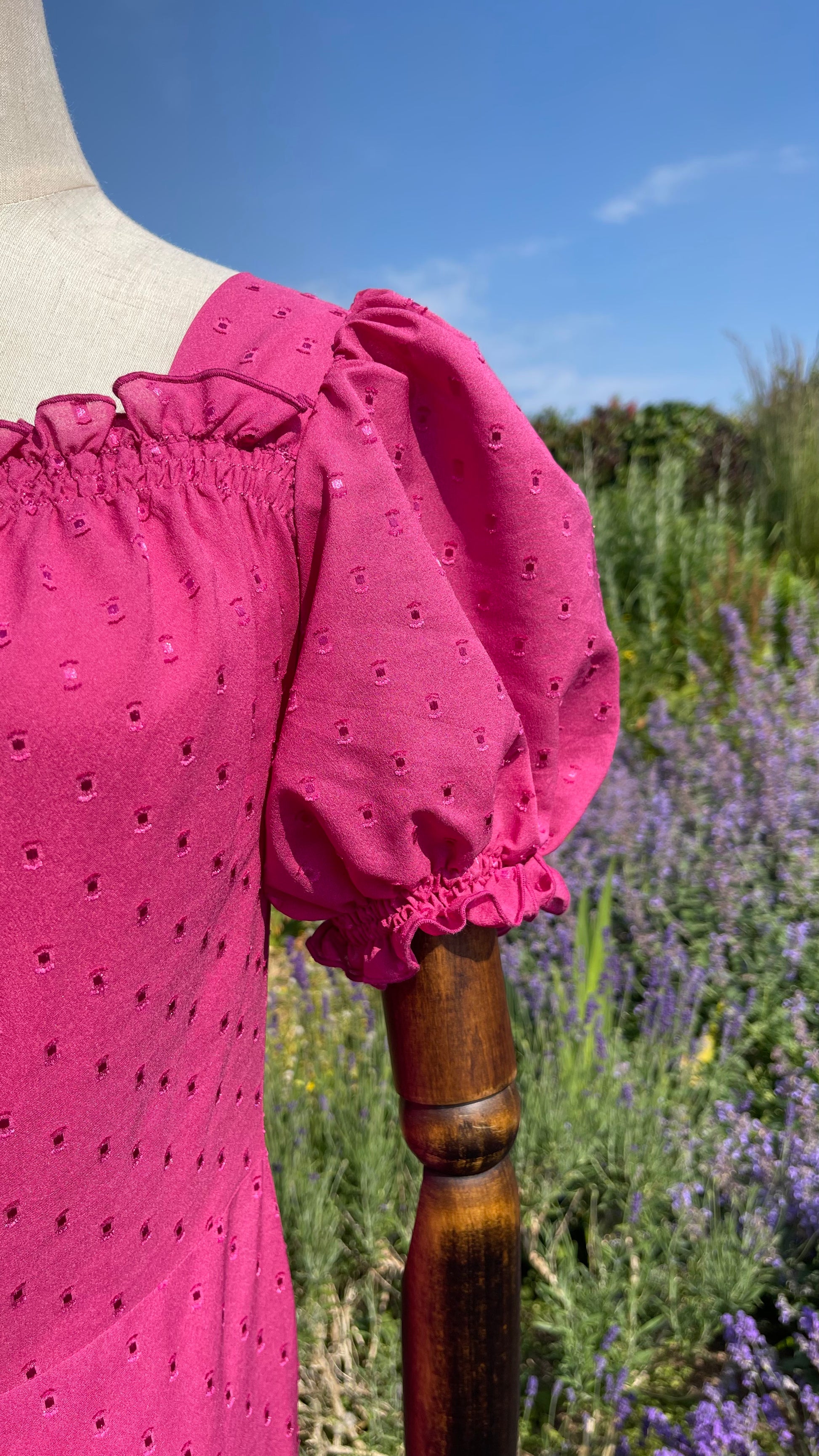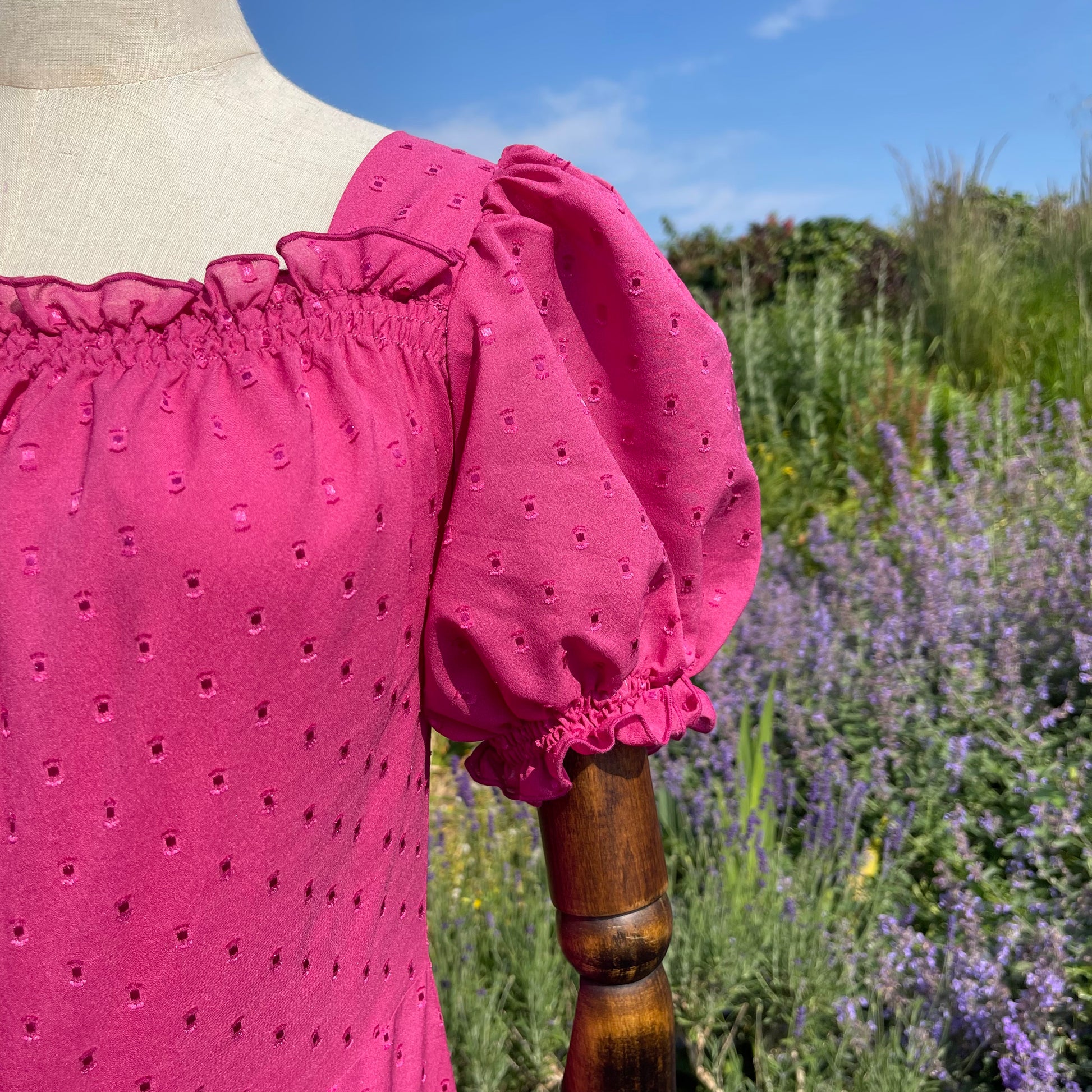 Vintage 1970s peasant ruffle puff sleeve maxi dress in magenta pink