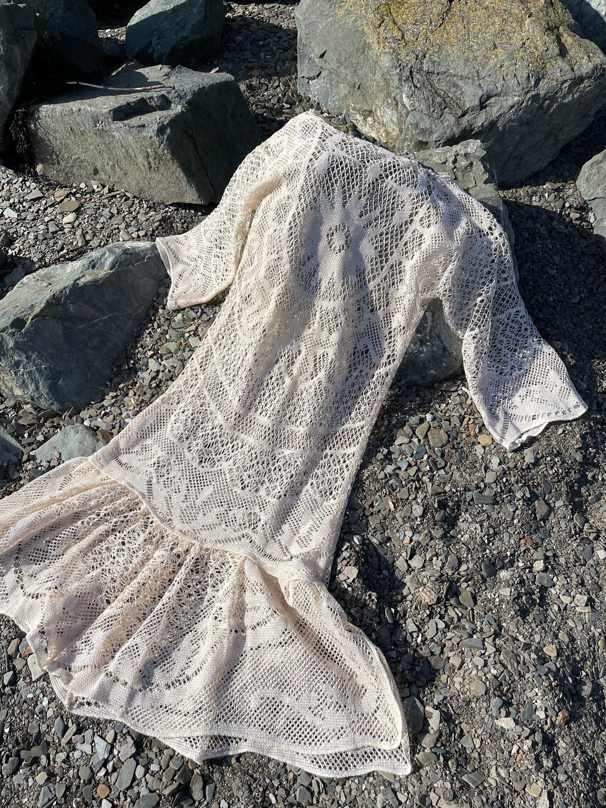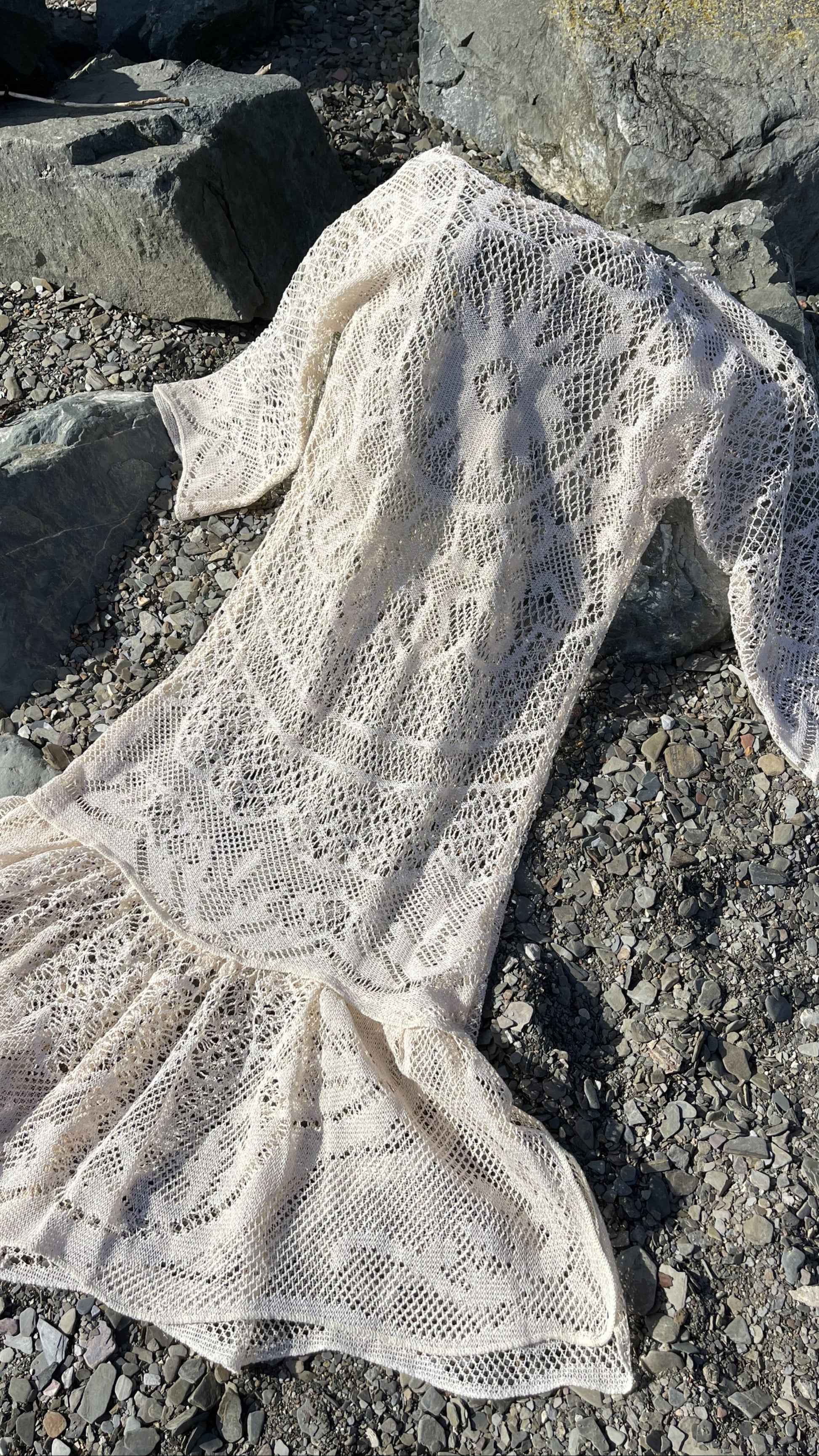 The measurements are a relaxed fit to suit many and are approximately: 21” bust, floating 20” waist, 17” inner sleeve and 50” length. Very similar fit to the now sold out Cream Crochet