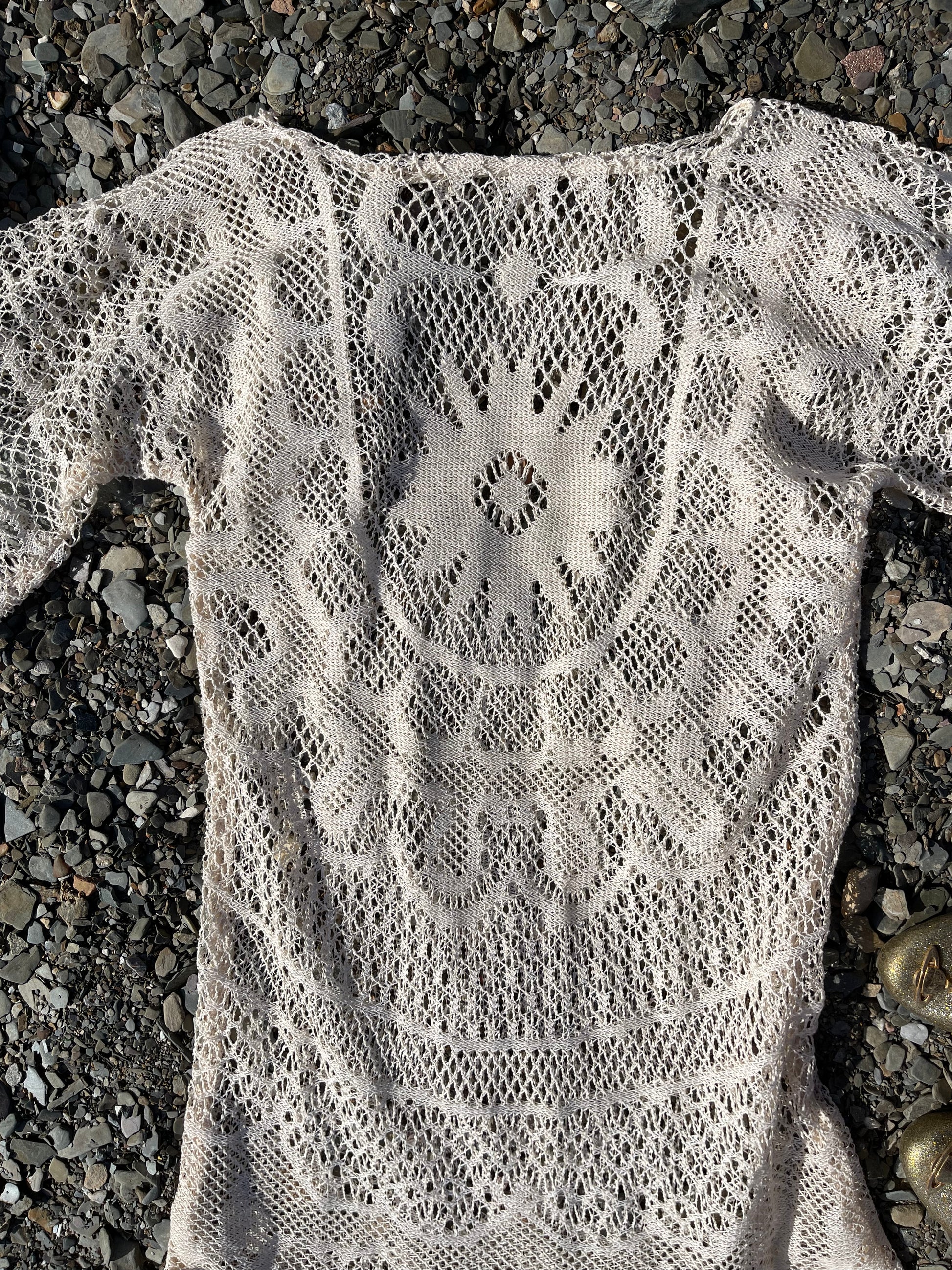 Crochet earns its coveted status with ease and this rare cream coloured example is no exception. Intricate crochet work, featuring a central sun style motif, cascade across the whole body of the dress. It’s relaxed yet flattering cut accompanied with statement bell sleeves really give the Ibizan Bohemian aesthetic. It could happily be worn over a light slip dress for a boho day to night look with ease. Crochet is one of the holy grails of vintage and such a rarity to find. It is one of a kind and was handcrafted from vintage 1970s fabric.
