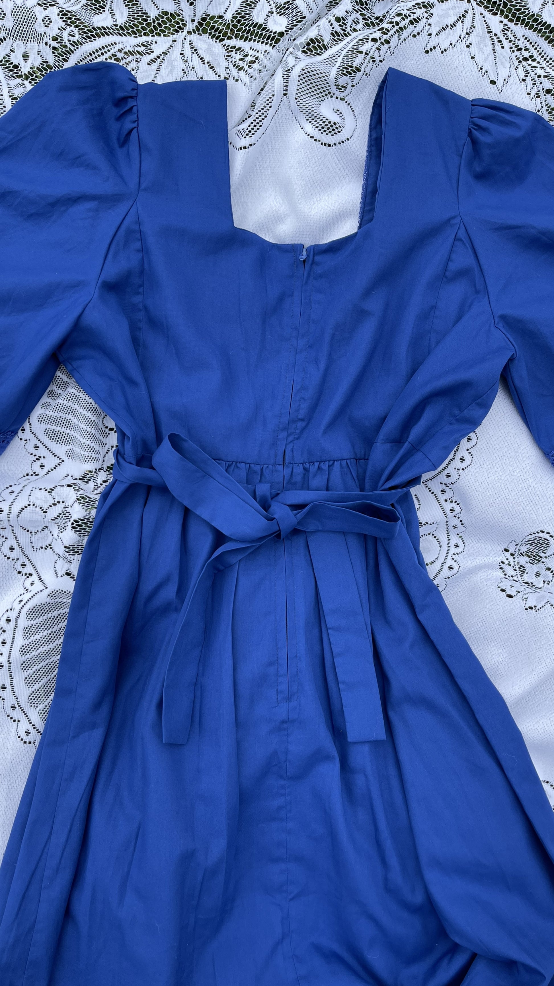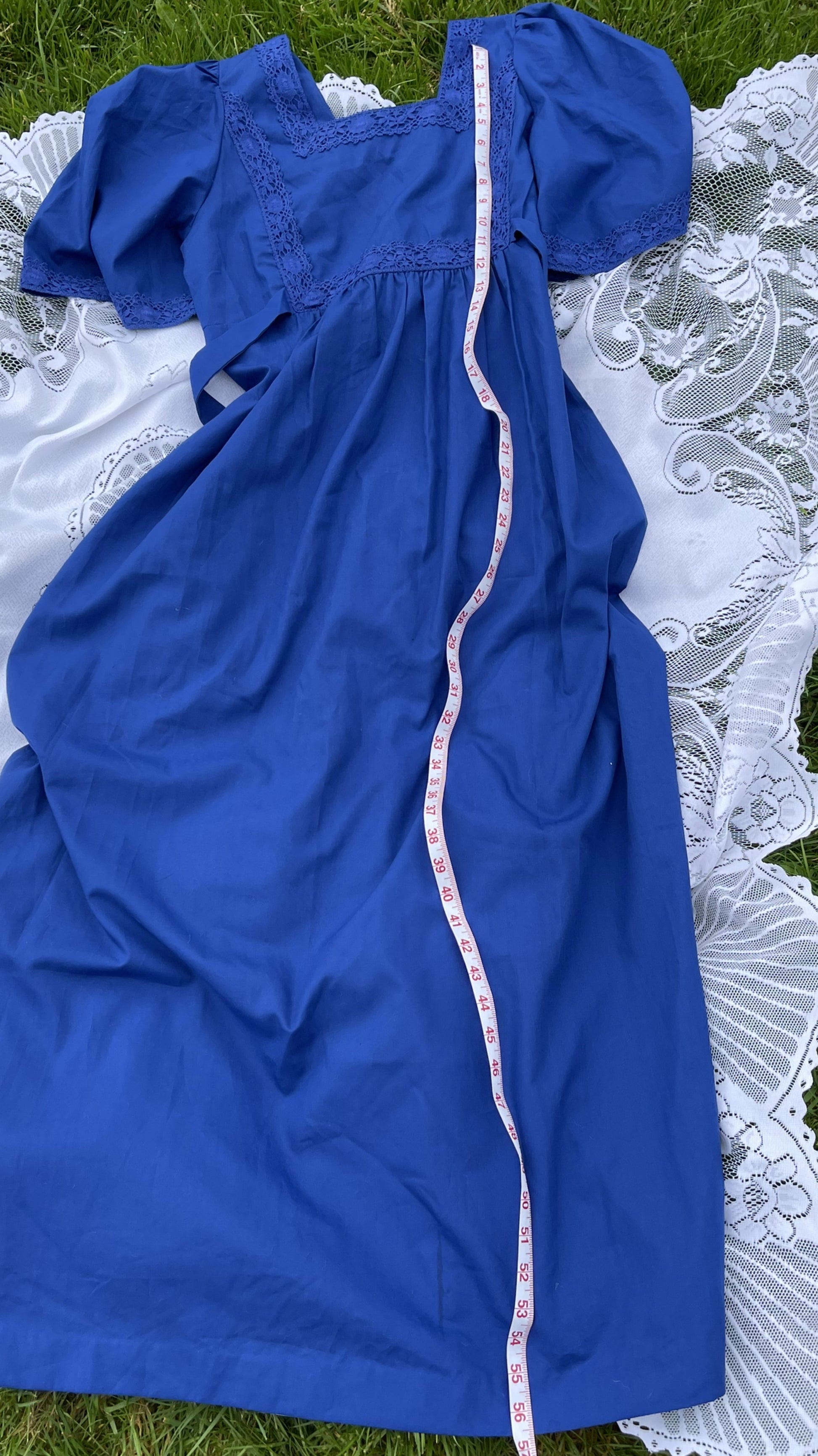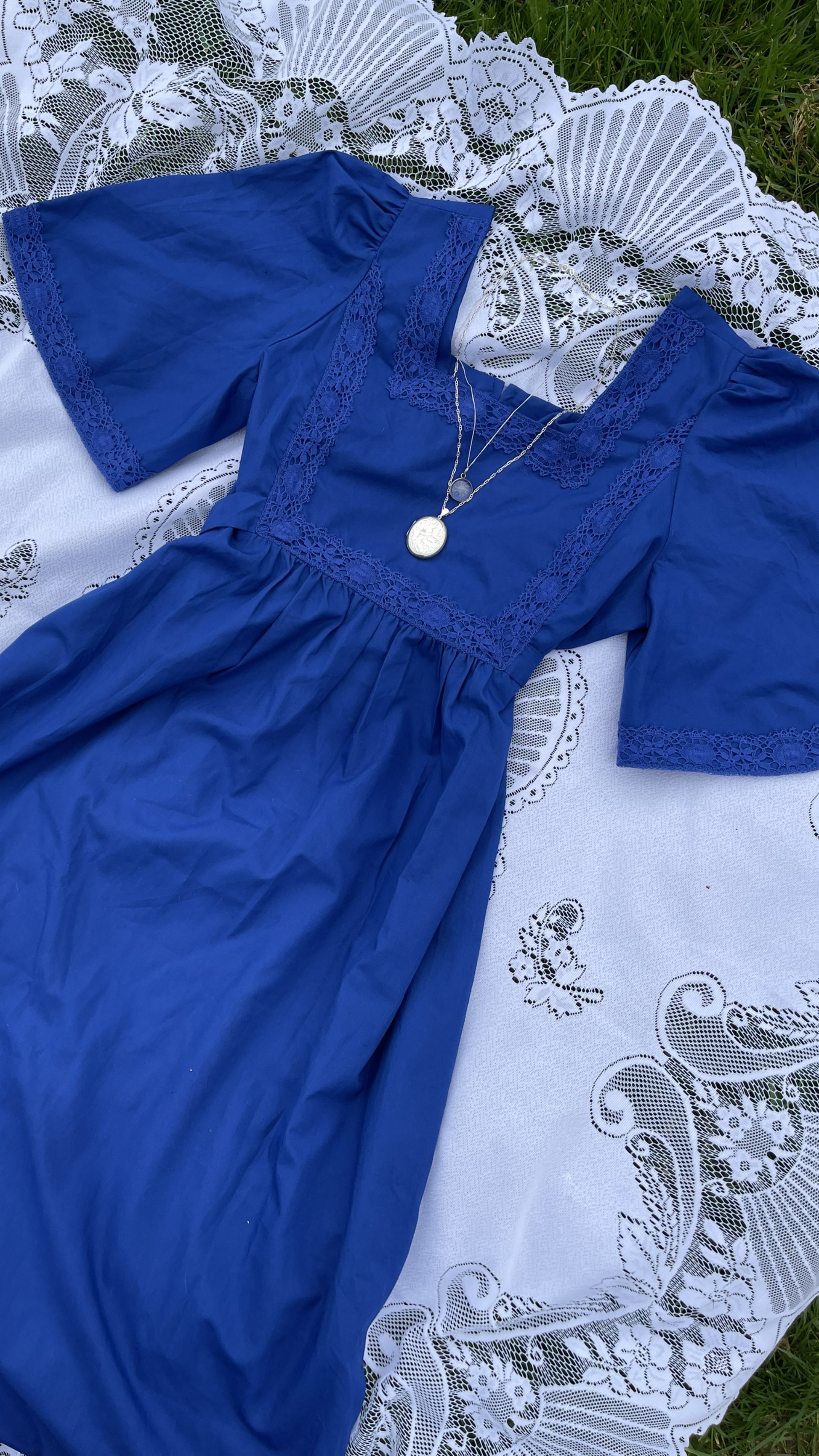 A transitional spring dress comes no lovelier than The Hyacinth. Full maxi length in china blue with angel butterfly sleeves, crochet trim and waist tie. Comfortable and easy to wear but oh so chic. Rare to find a more generous size, this is suggested to suit up to a uk 14-16