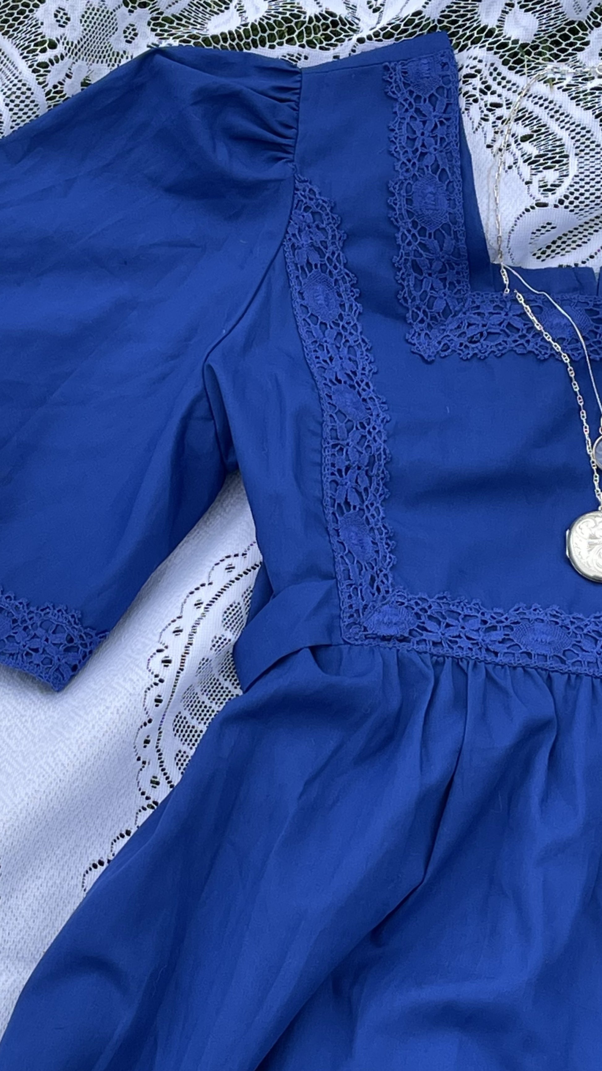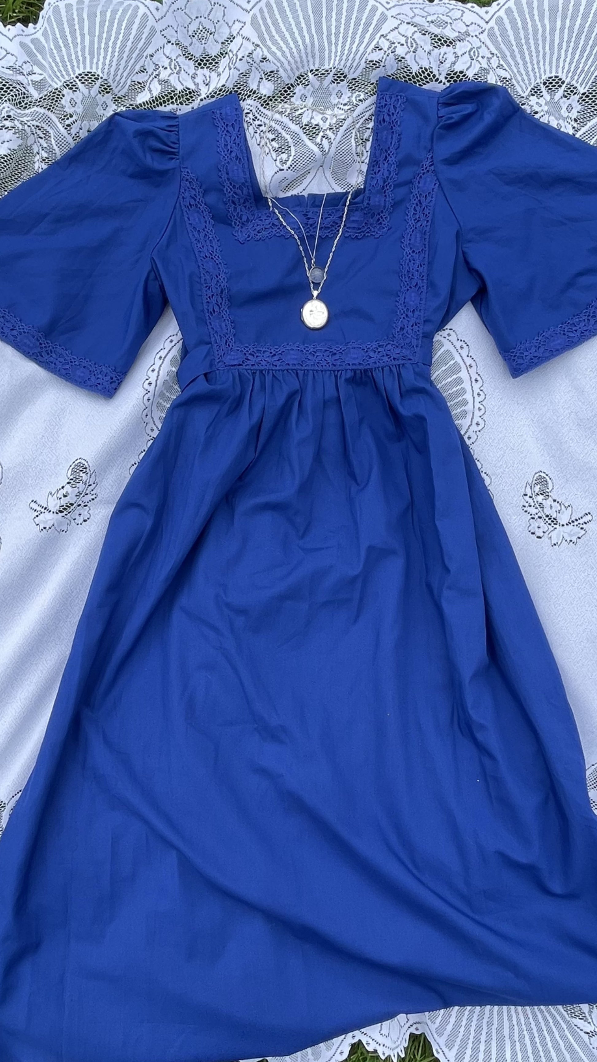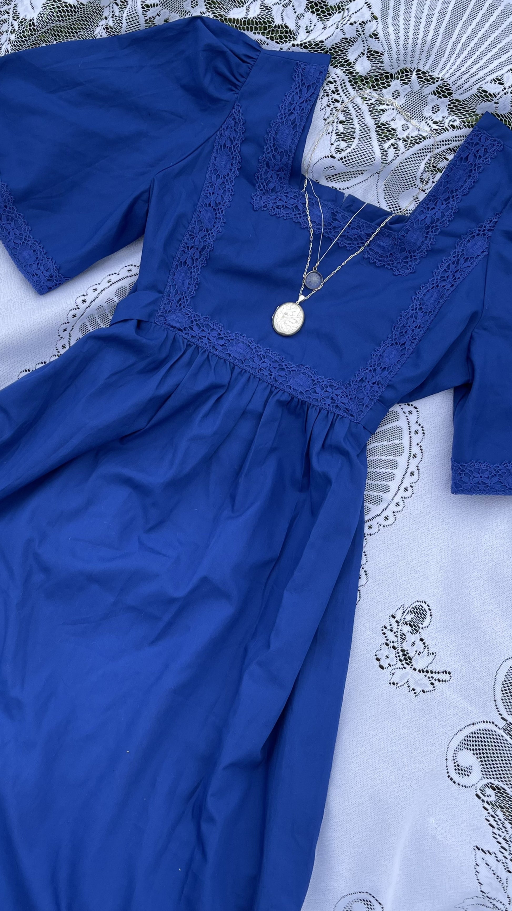A transitional spring dress comes no lovelier than The Hyacinth. Full maxi length in china blue with angel butterfly sleeves, crochet trim and waist tie. Comfortable and easy to wear but oh so chic. Rare to find a more generous size, this is suggested to suit up to a uk 14-16