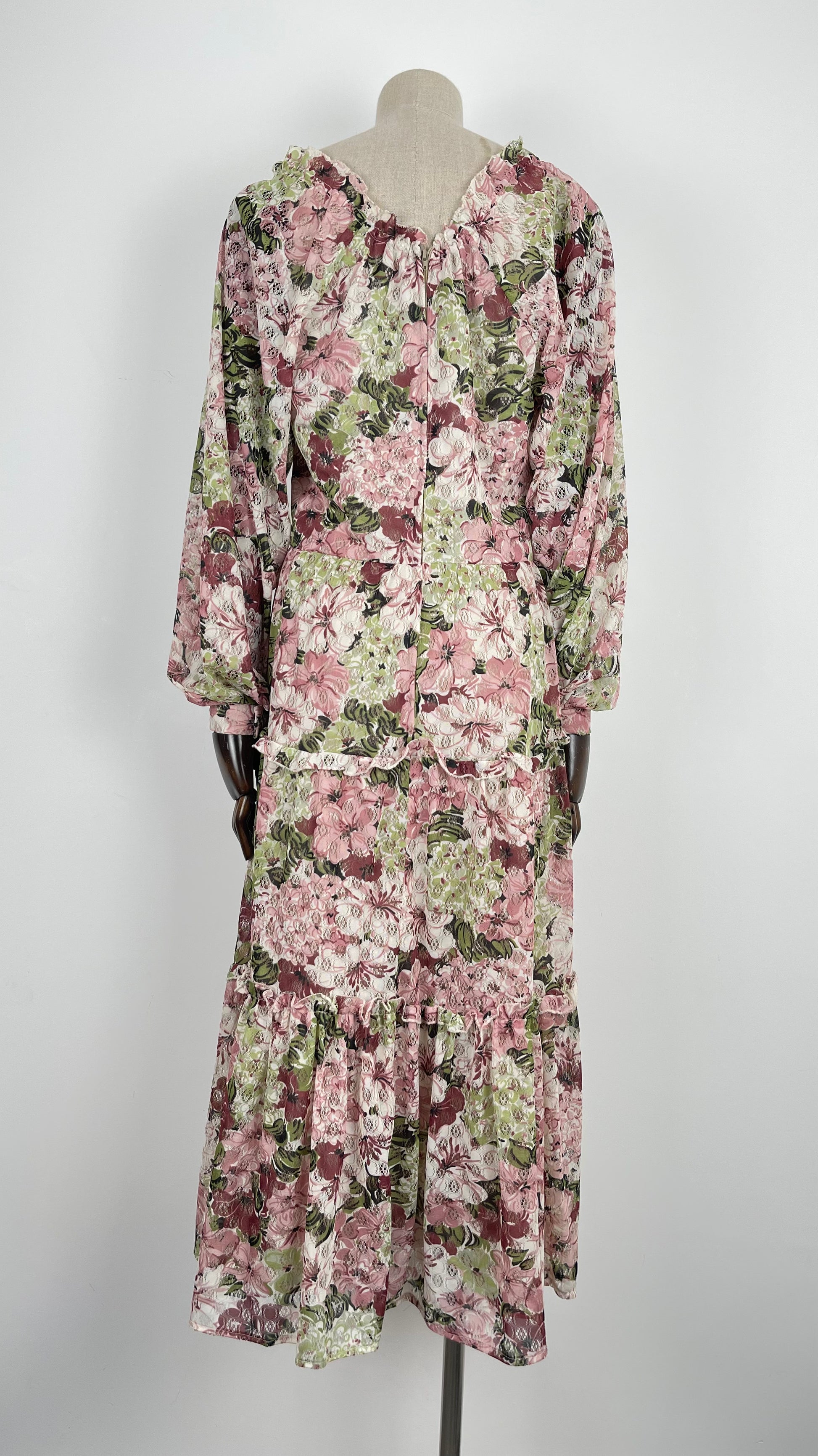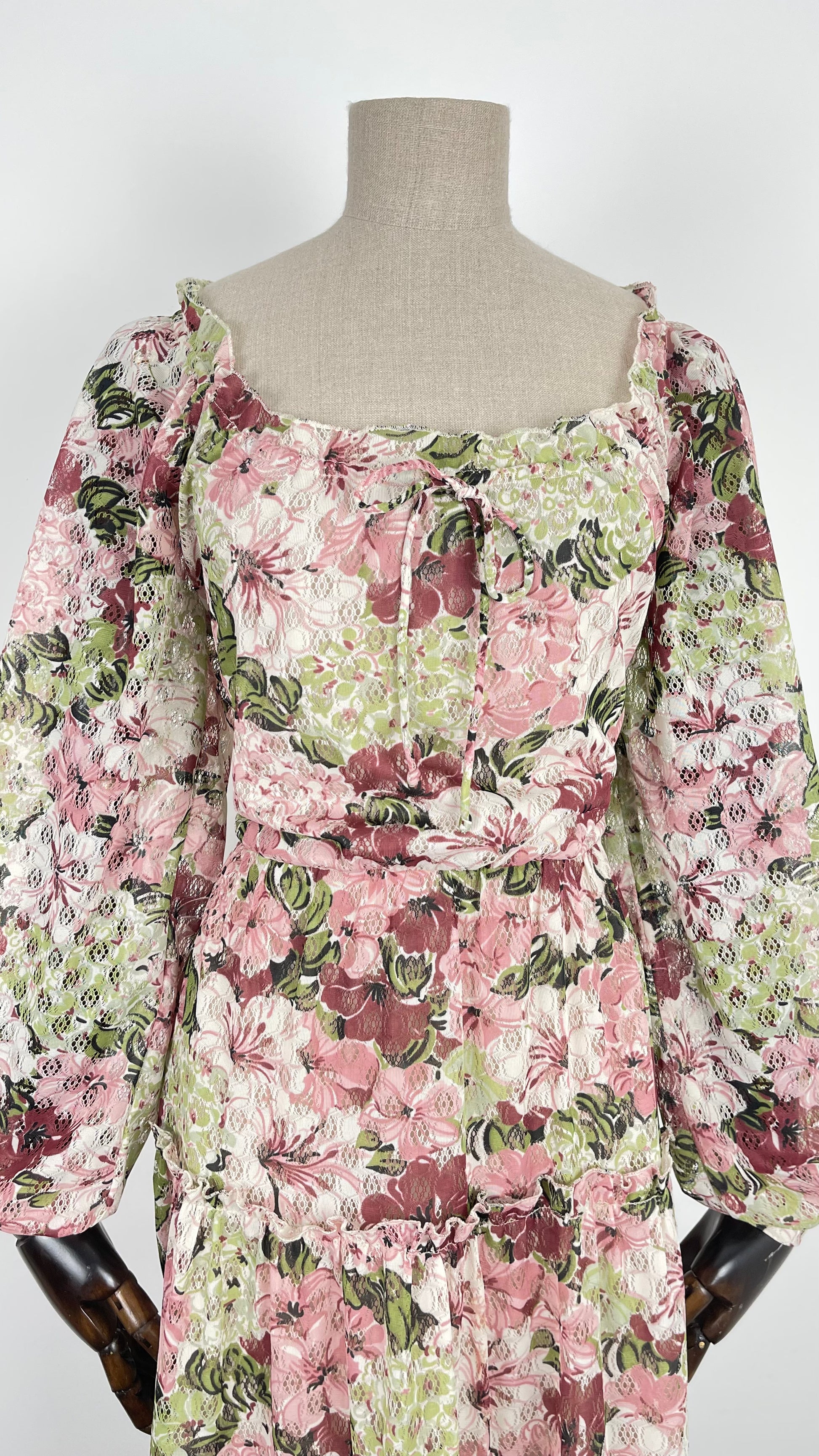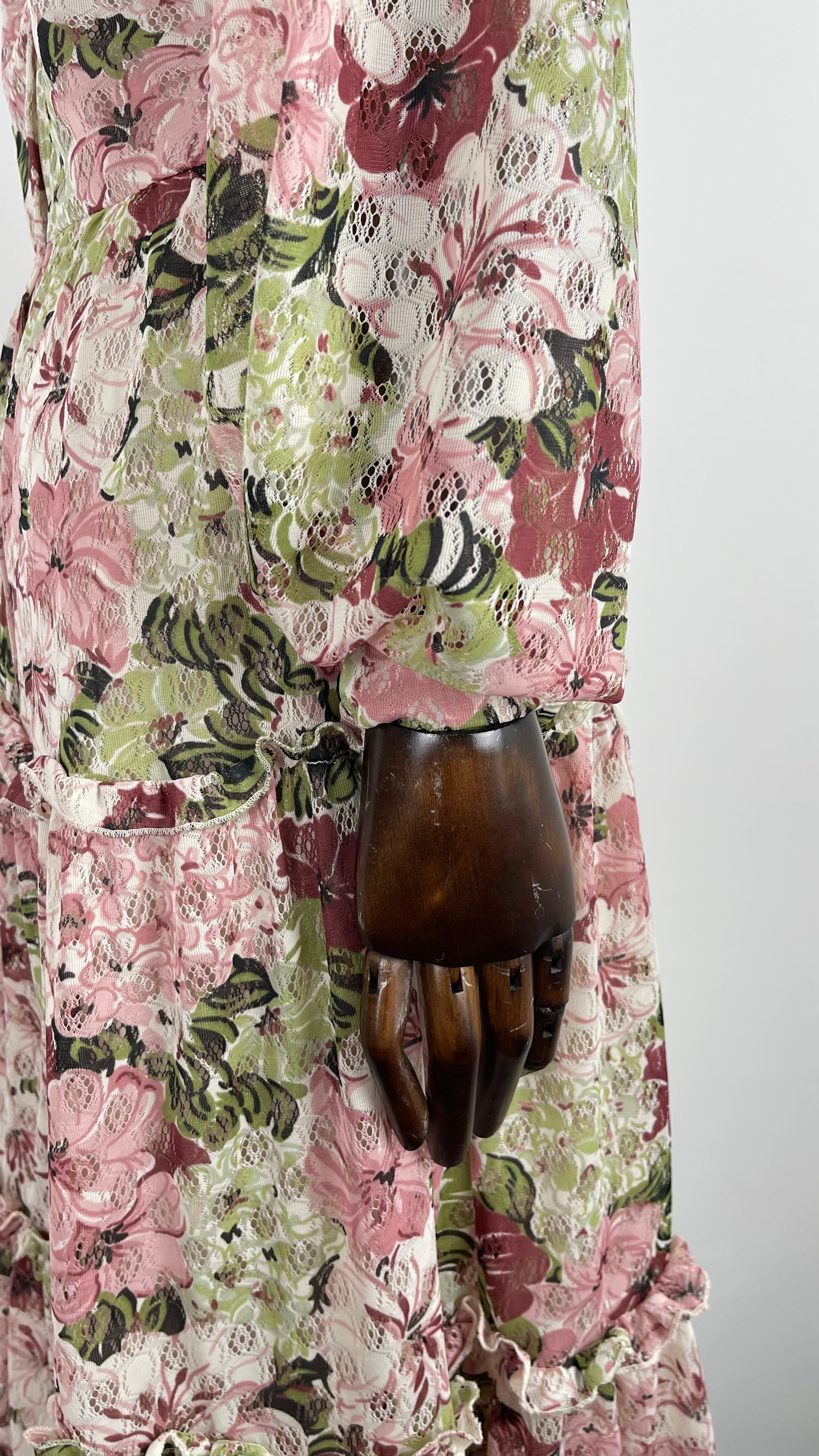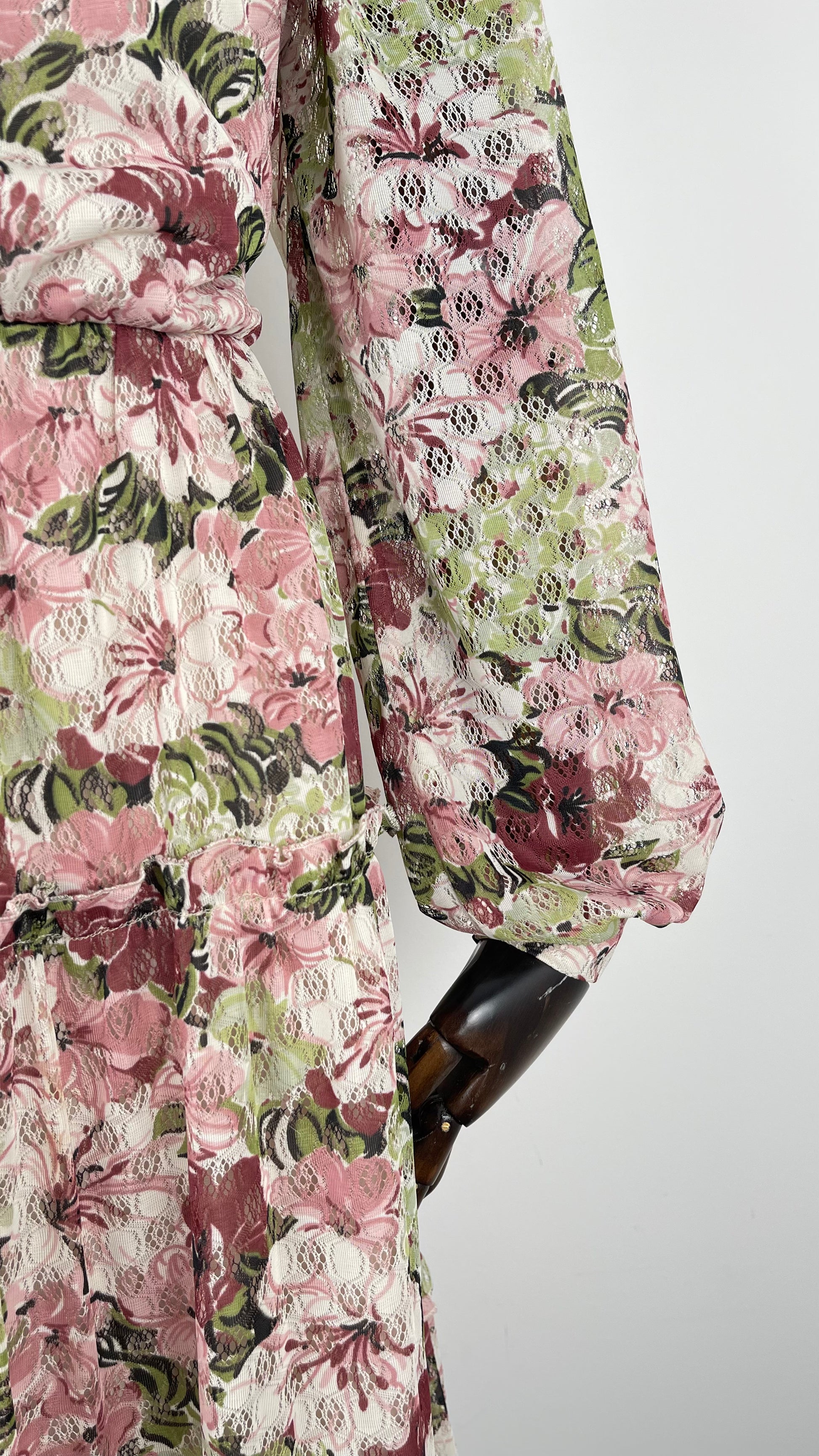 This beautiful peasant dress is by the collectible label Kati and features beautiful floral print on lace. A slightly ruched sweetheart neckline, balloon sleeves and tiered shape gives this piece the iconic 1970s bohemian style.