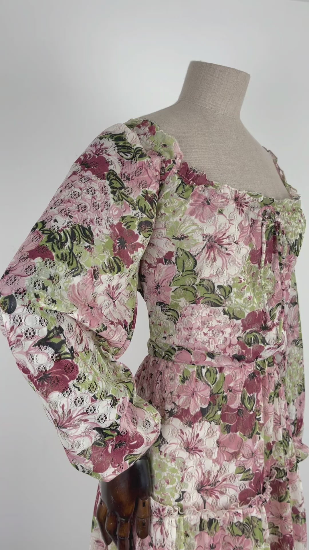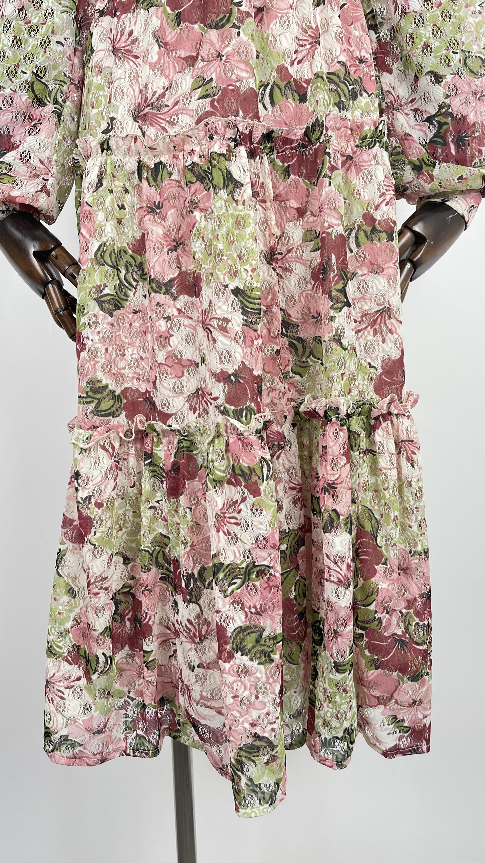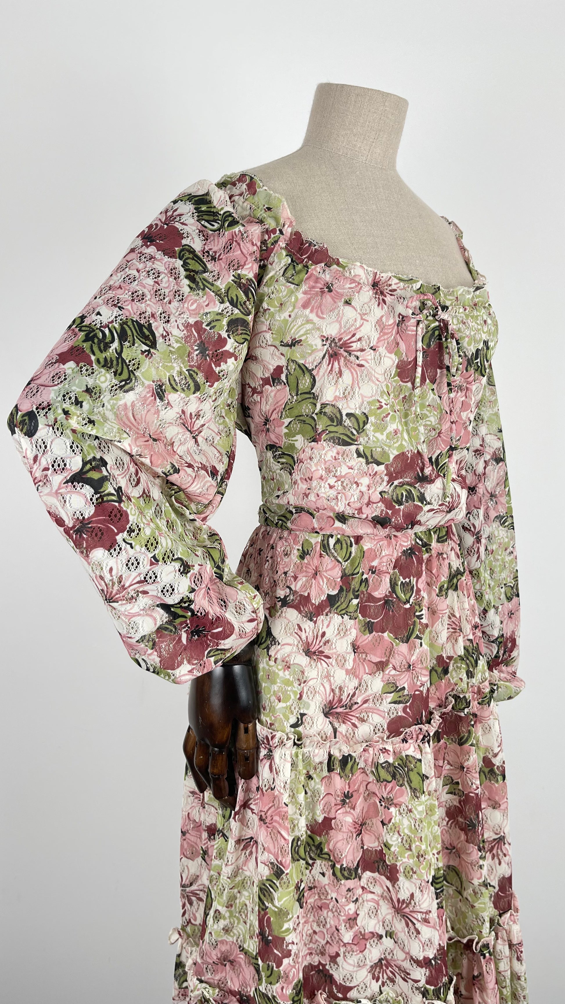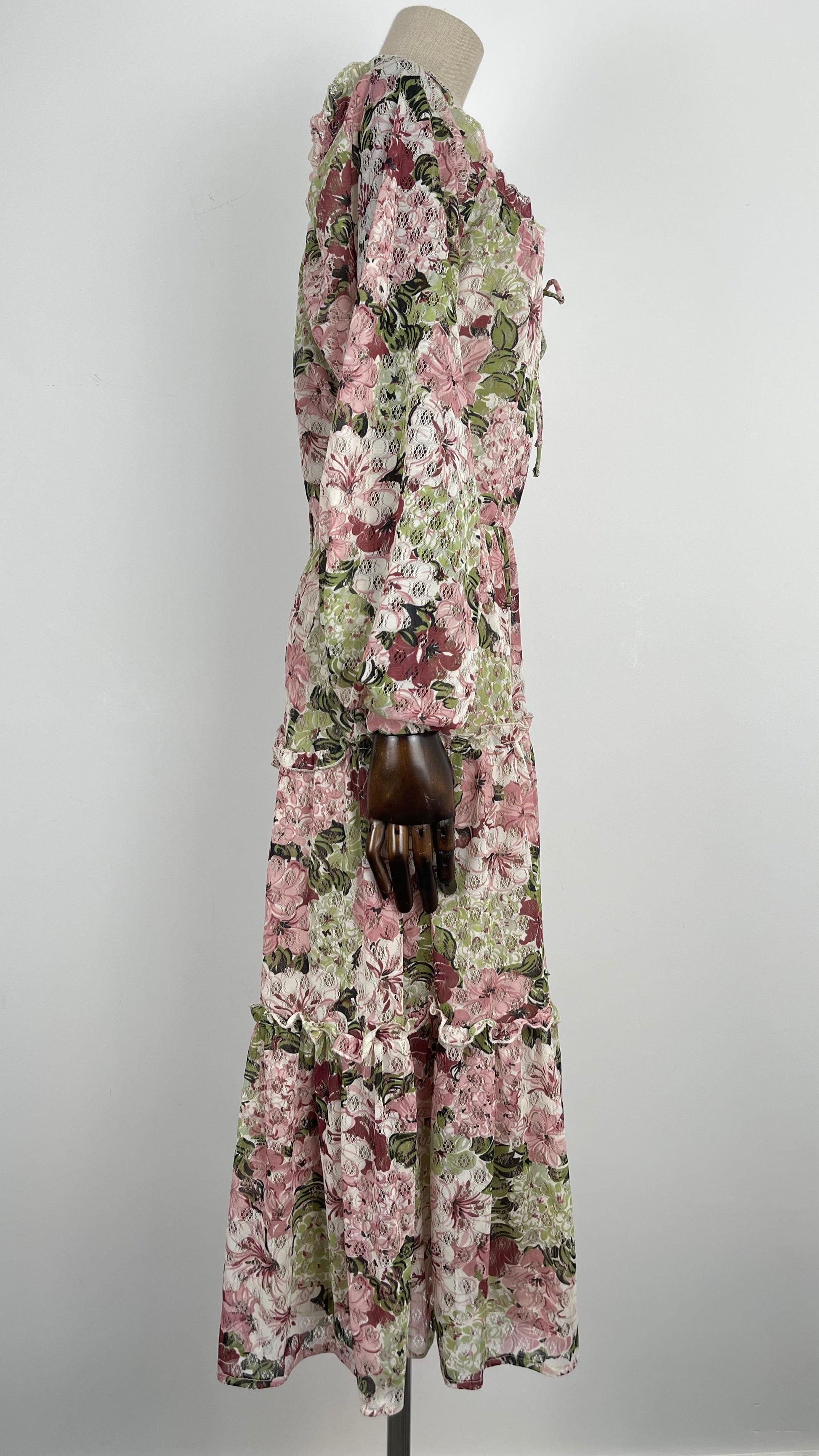 This beautiful peasant dress is by the collectible label Kati and features beautiful floral print on lace. A slightly ruched sweetheart neckline, balloon sleeves and tiered shape gives this piece the iconic 1970s bohemian style.