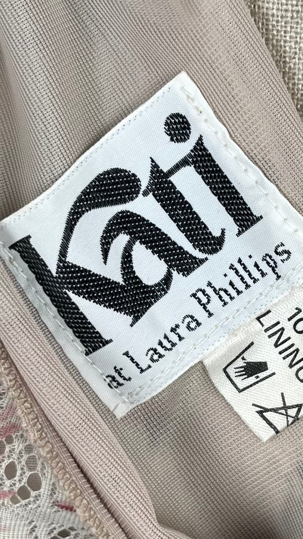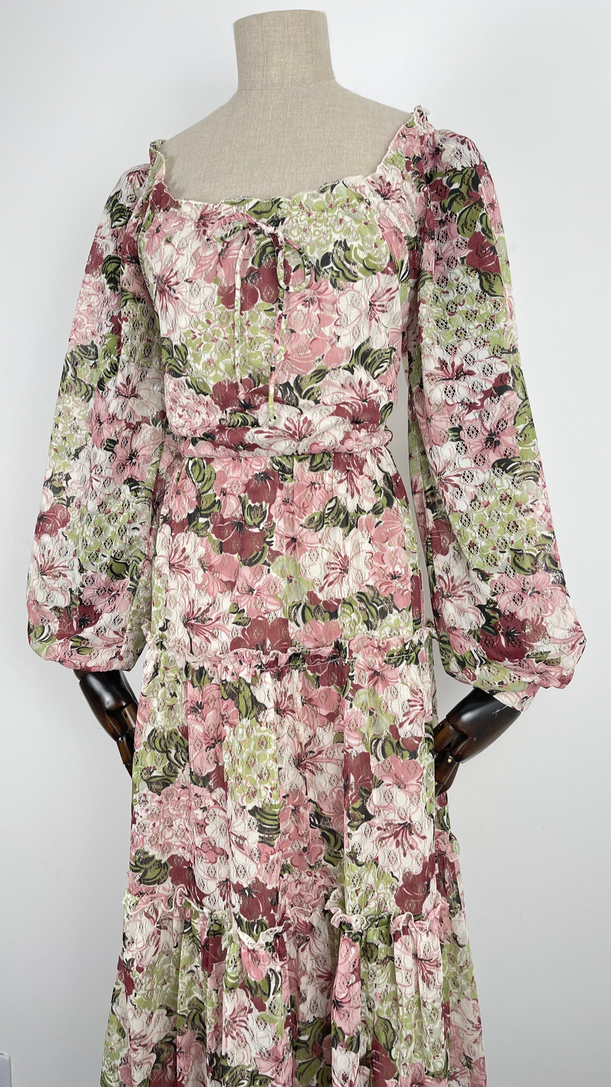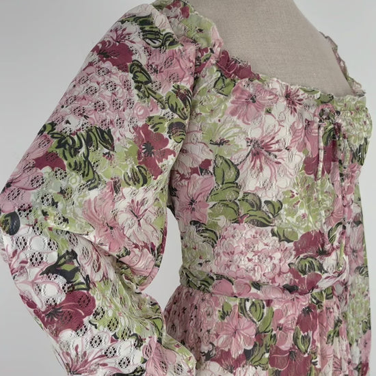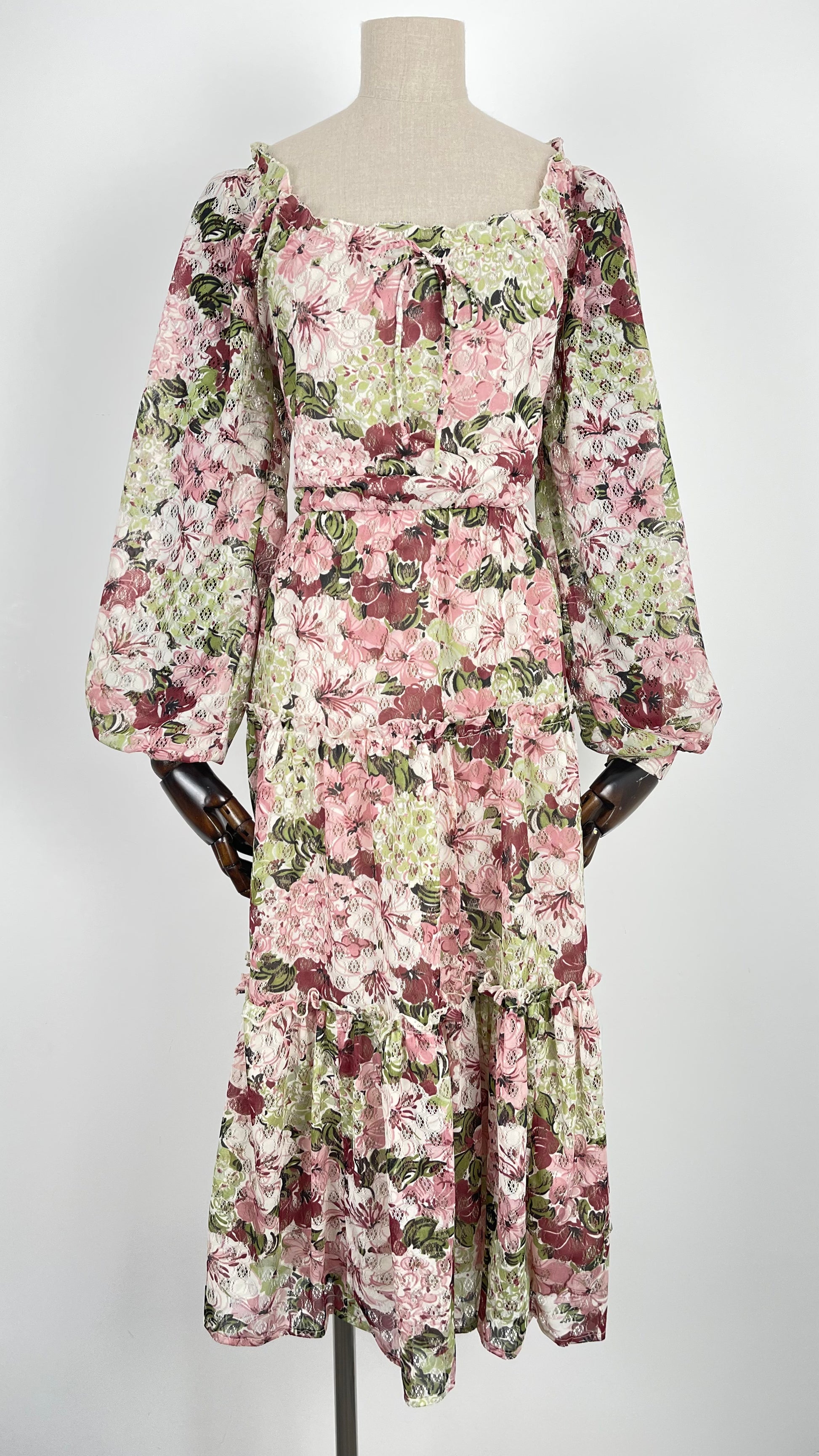 This beautiful peasant dress is by the collectible label Kati and features beautiful floral print on lace. A slightly ruched sweetheart neckline, balloon sleeves and tiered shape gives this piece the iconic 1970s bohemian style.