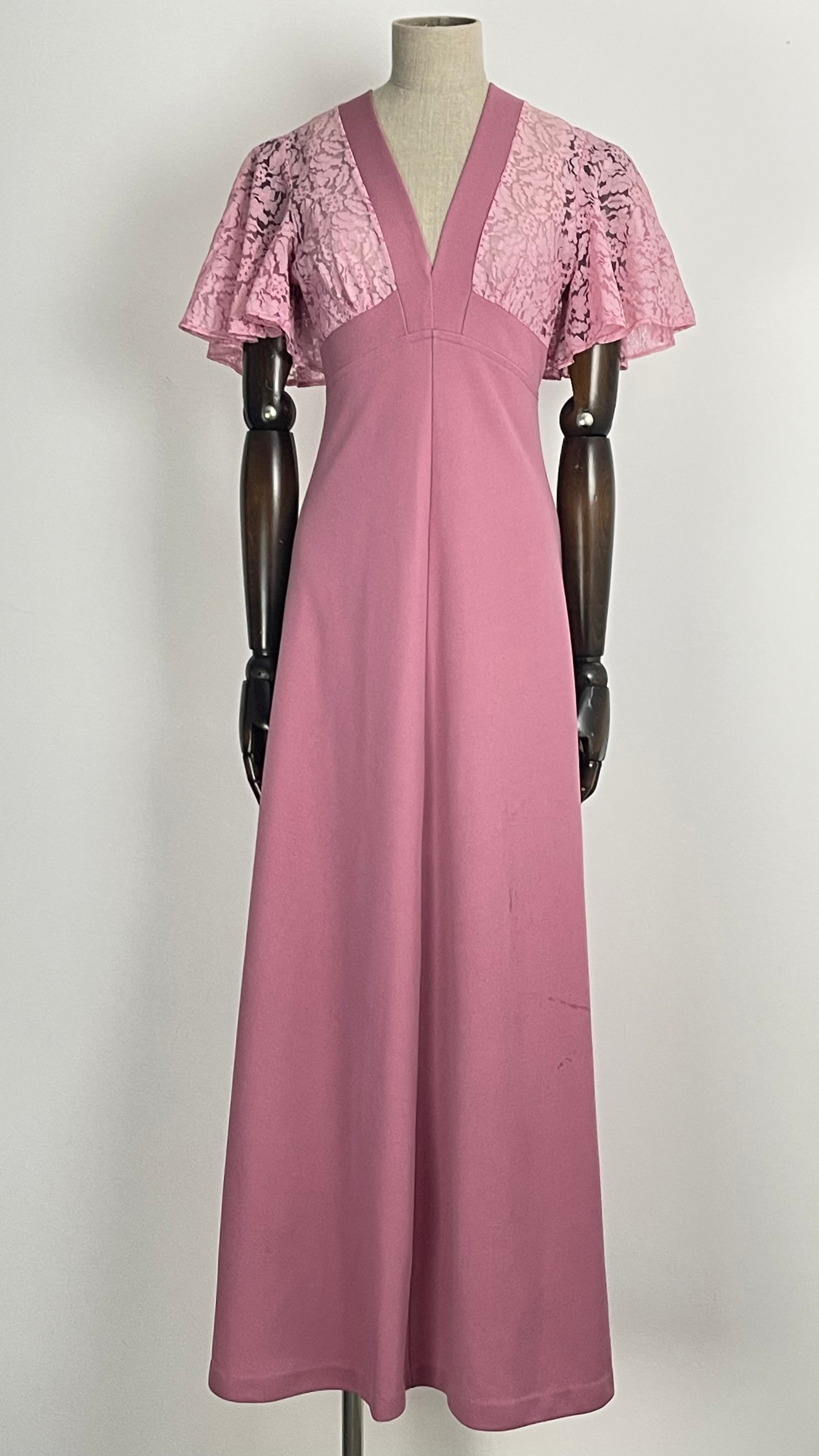 This 1970s take on an art deco aesthetic sees the iconic butterfly sleeve take a twist in romantic lace emanating out from a plunge lace bust. The floating sleeves sit at top a cinched waist which falls into an elongated full length skirt.