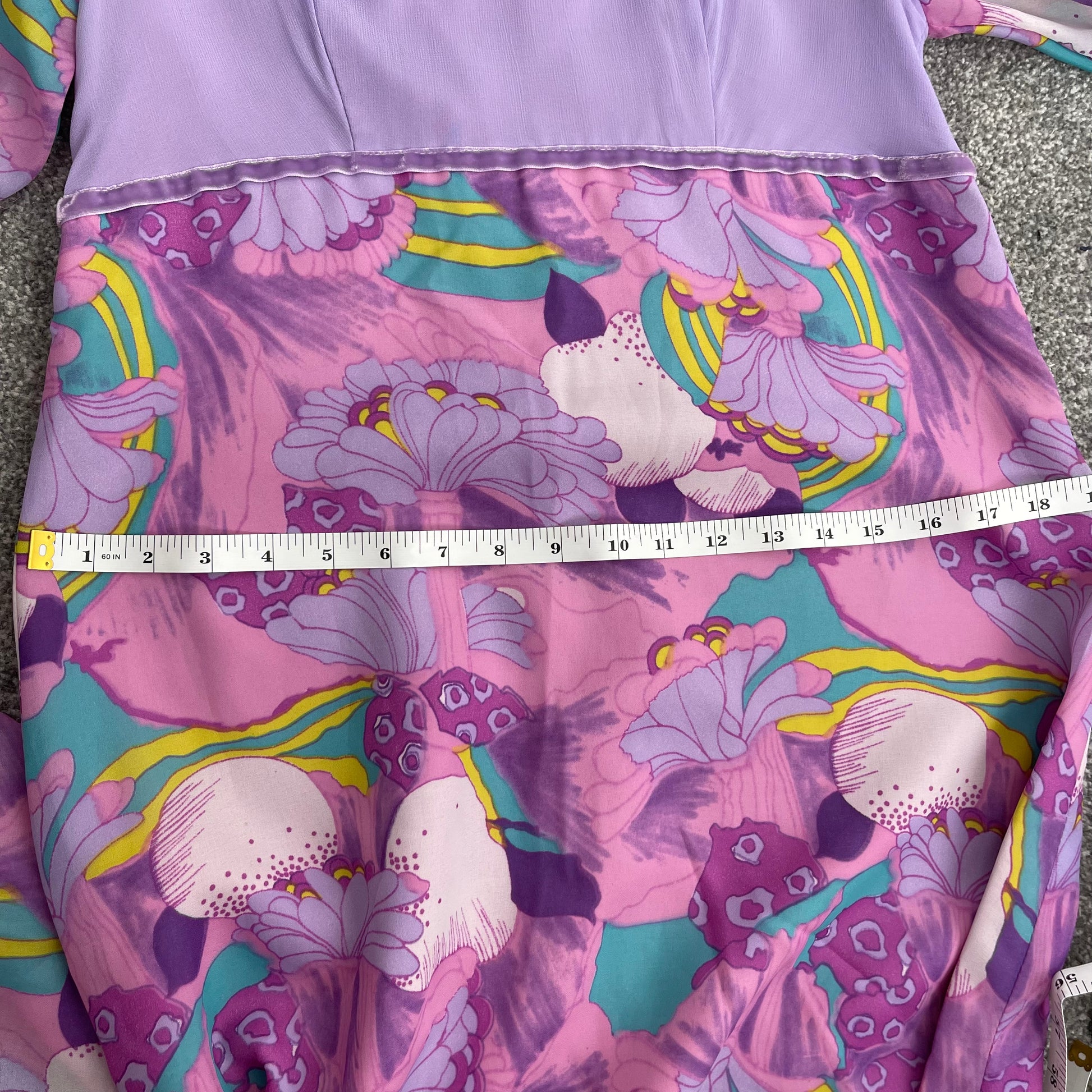 Vintage late 60s/70s Huge Sleeve Purple Maxi Dress RARE Juliet renaissance Boho This is a real show stopper and an incredible addition to anyone’s collection. Full length sleeves float aside this beautiful early 70s print, you can still hear the late 1960s. Excellent condition, near mint. Size: Estimated XS- Small, UK 6 8, mannequin is U.K. 6 for reference, please see measurements. Bust & underbust: 16” Floating waist: 19” Length: 55” Material: This is a synthetic material, semi sheer chiffon style on the sleeves |
