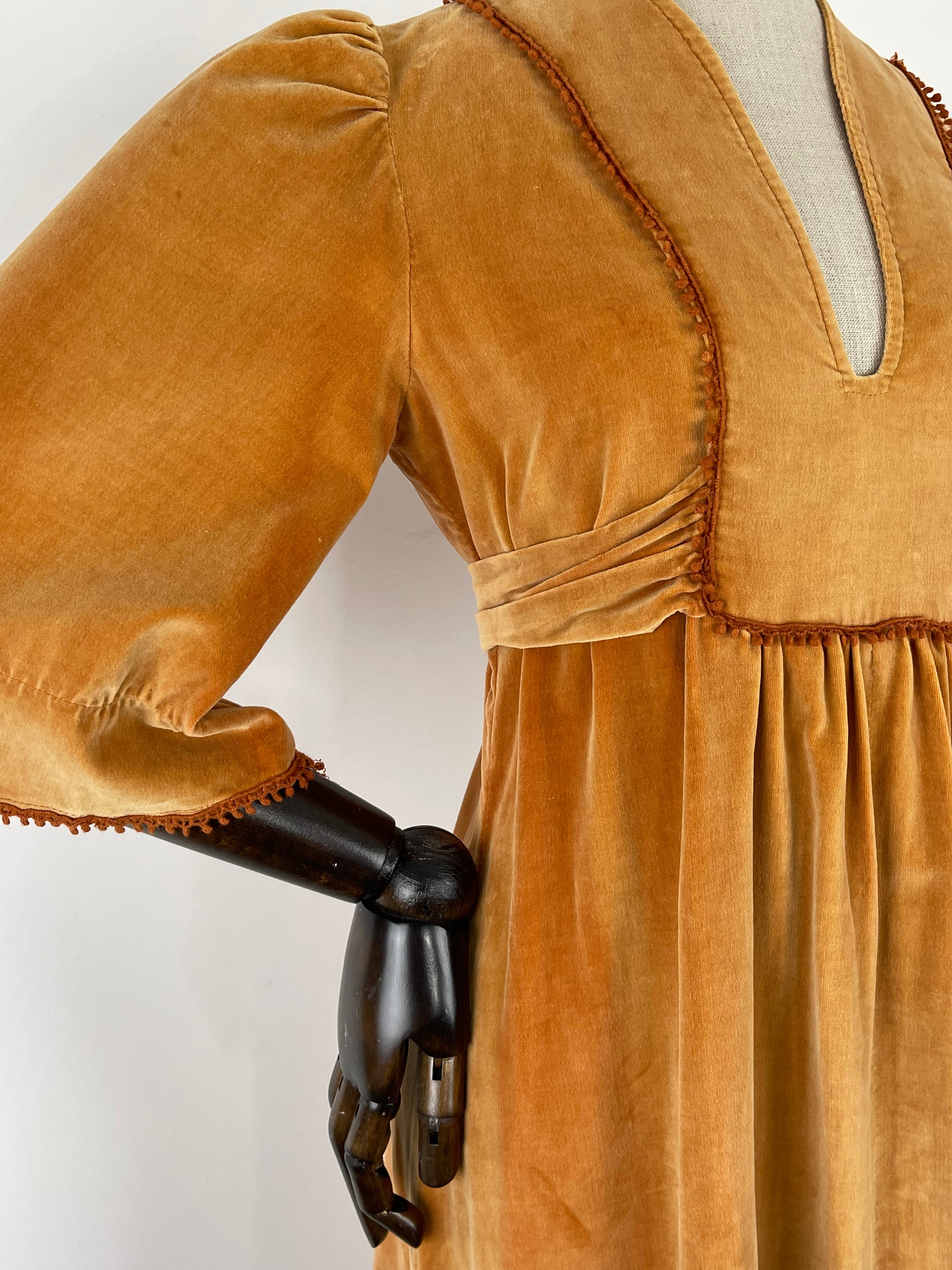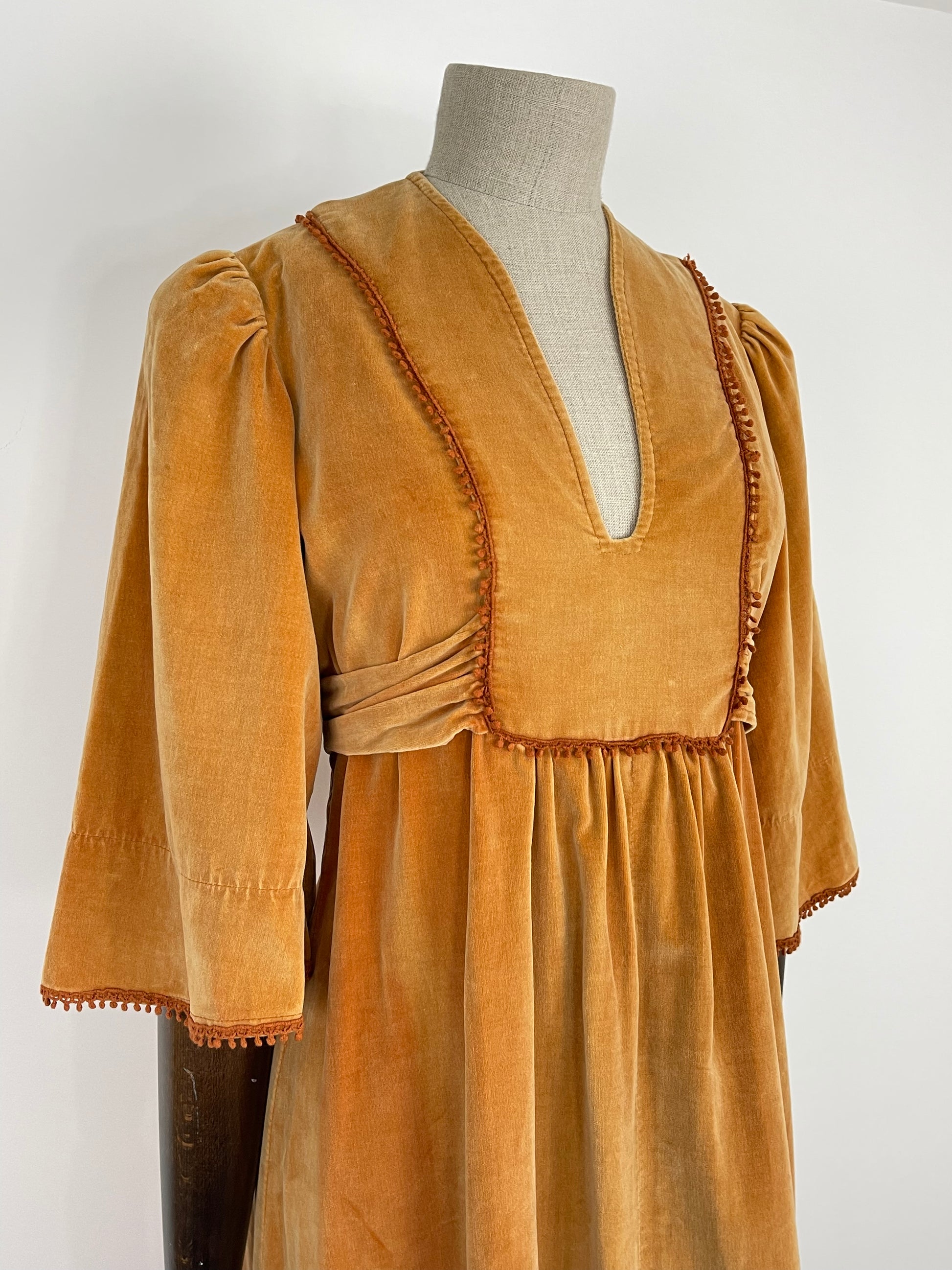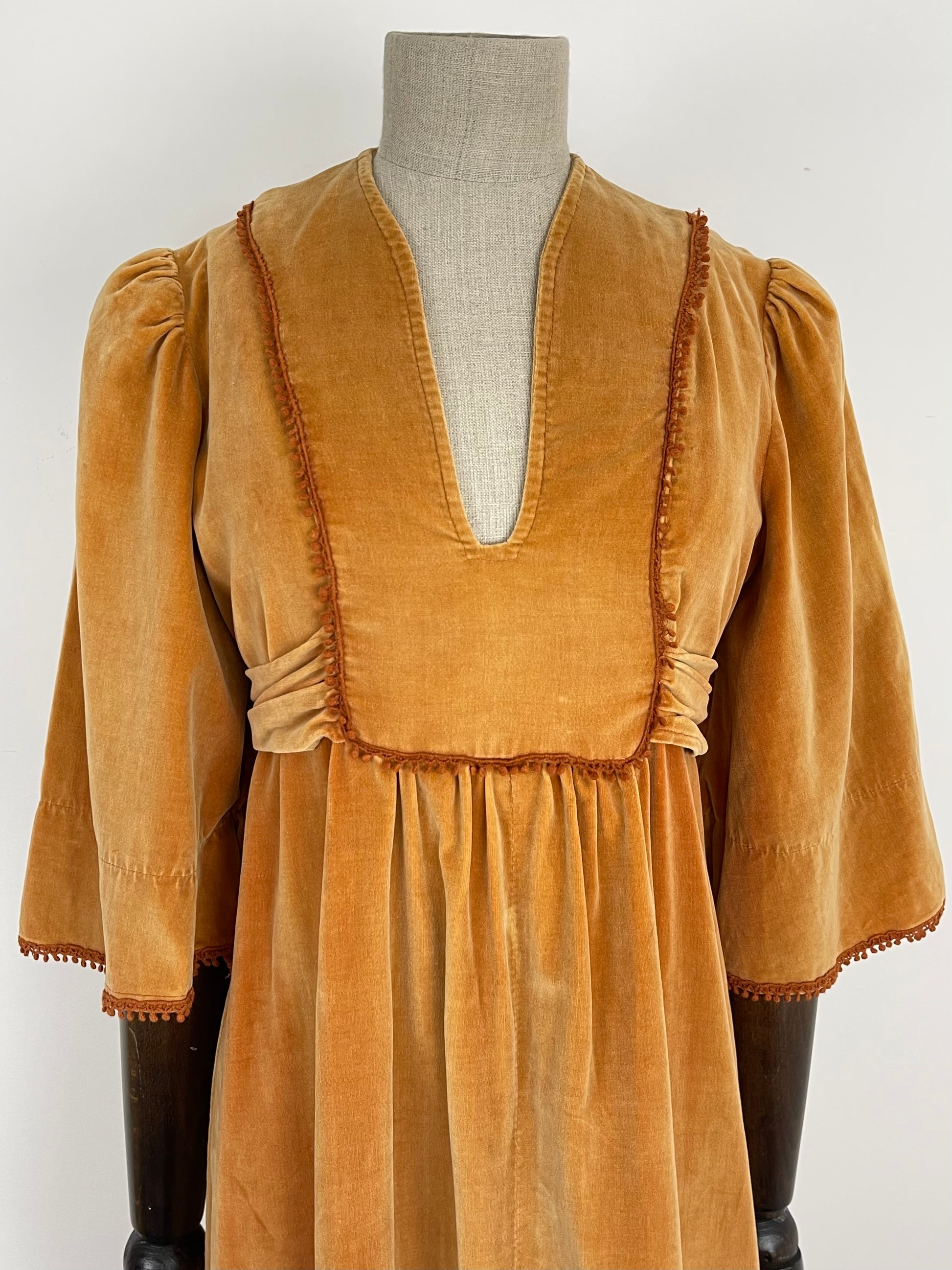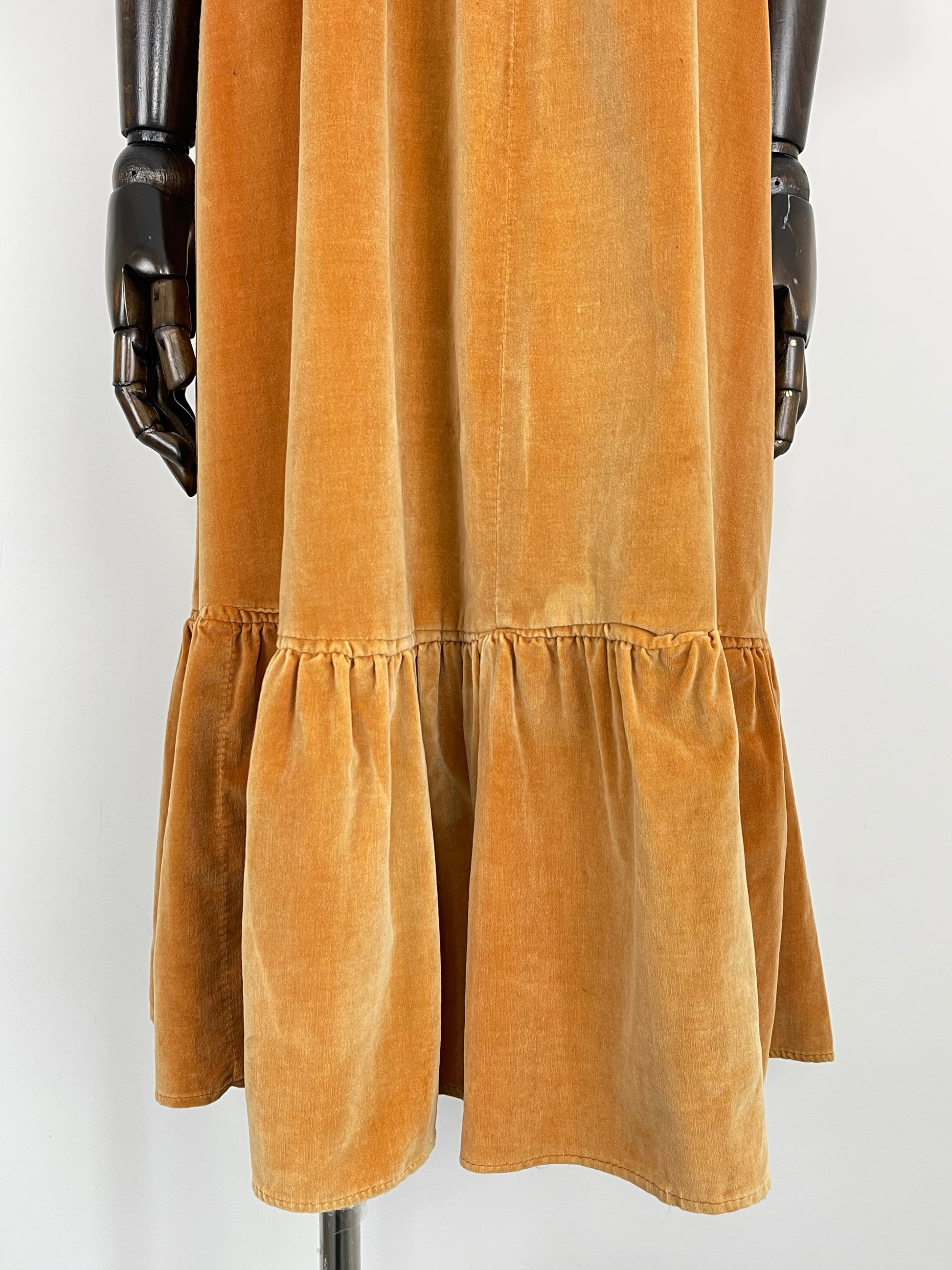 Condition: B, Good overall condition. As these original cotton/cotton velvet dresses are typically subject to, there is some colour difference over the dress, some parts are lighter than others and there is the odd tiny mark here and there. This is very much to be expected and really adds to its authenticity and charm. There is a small nibble of crochet detailing on the right hand side of the bust.