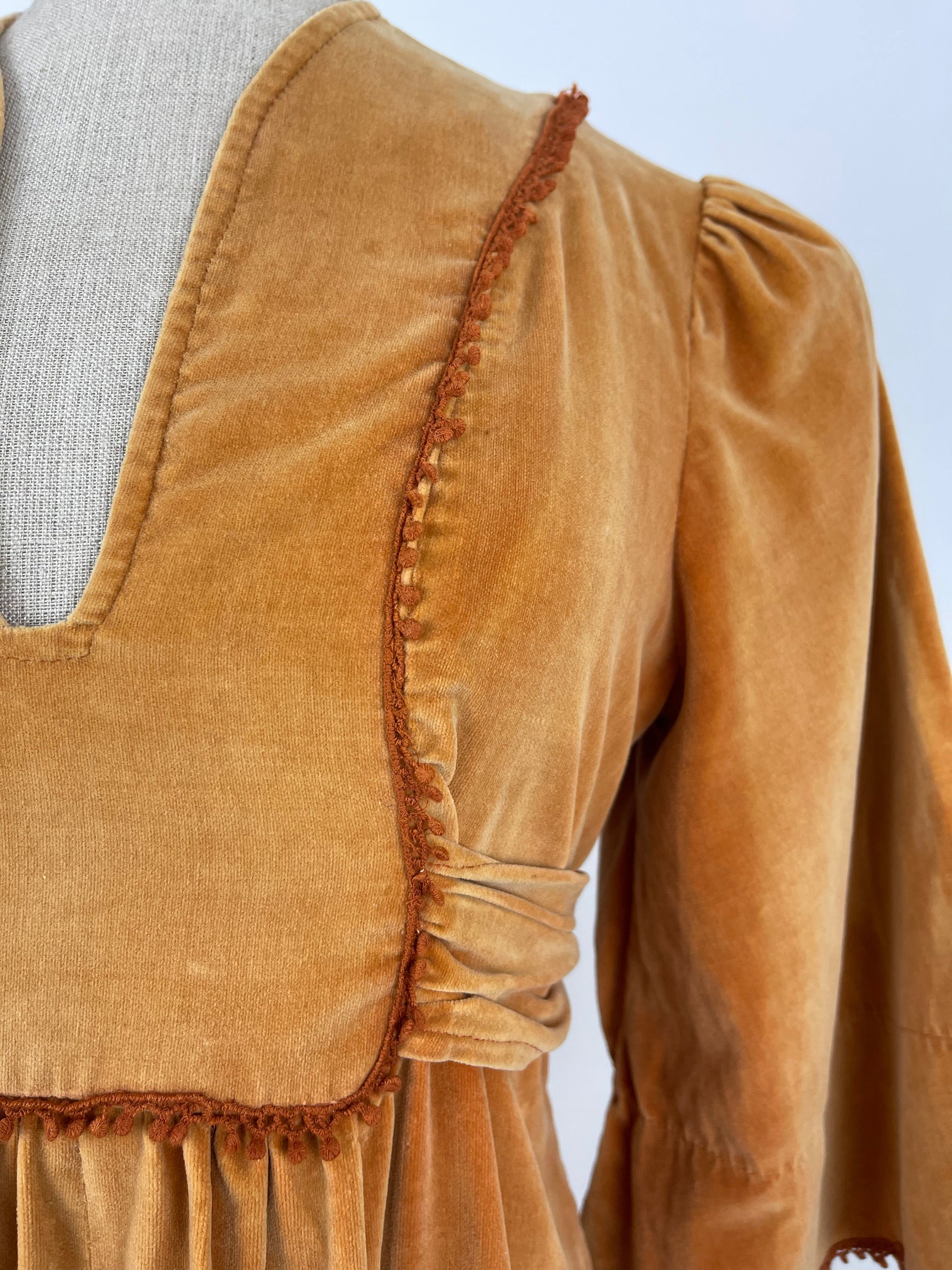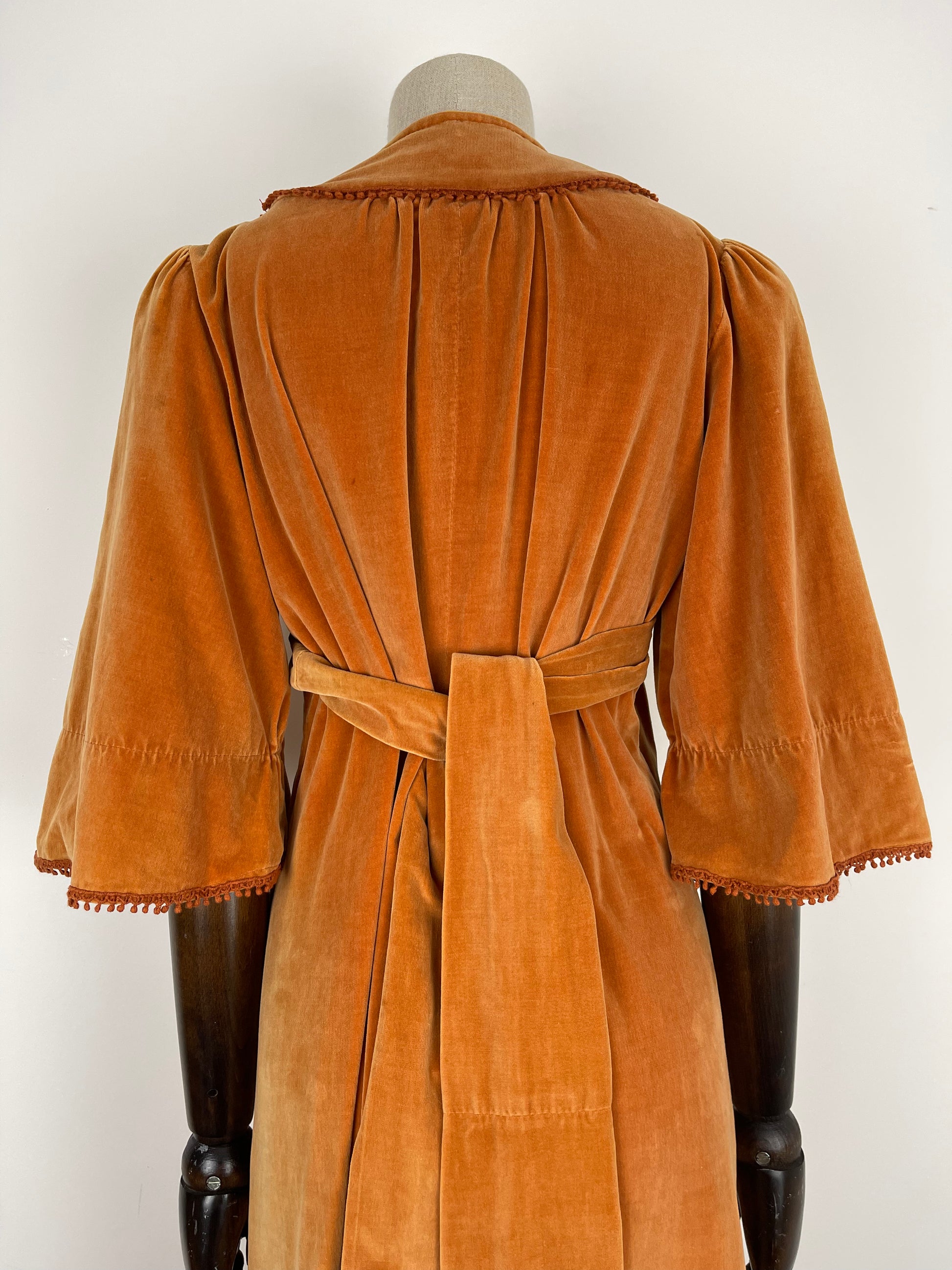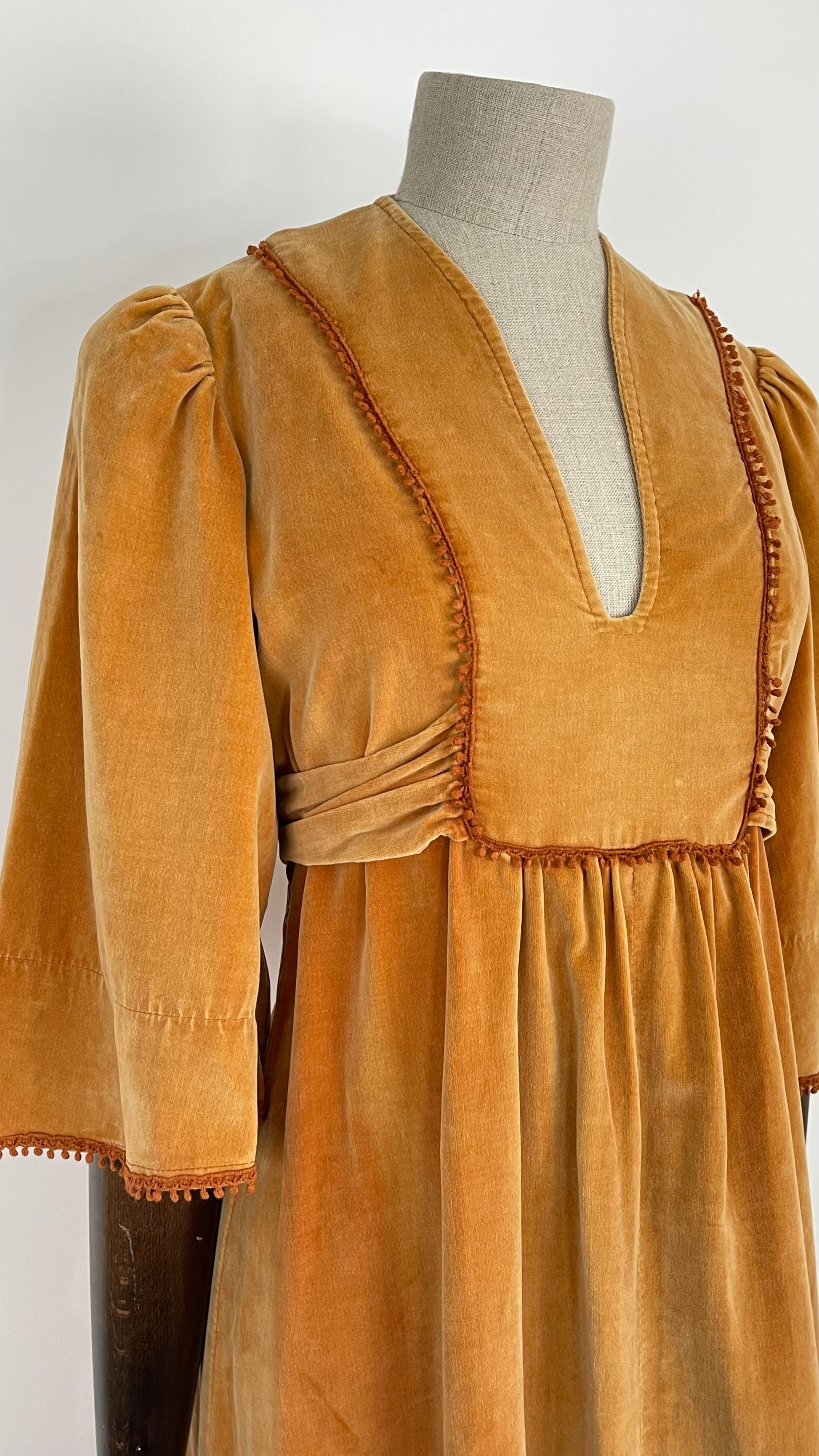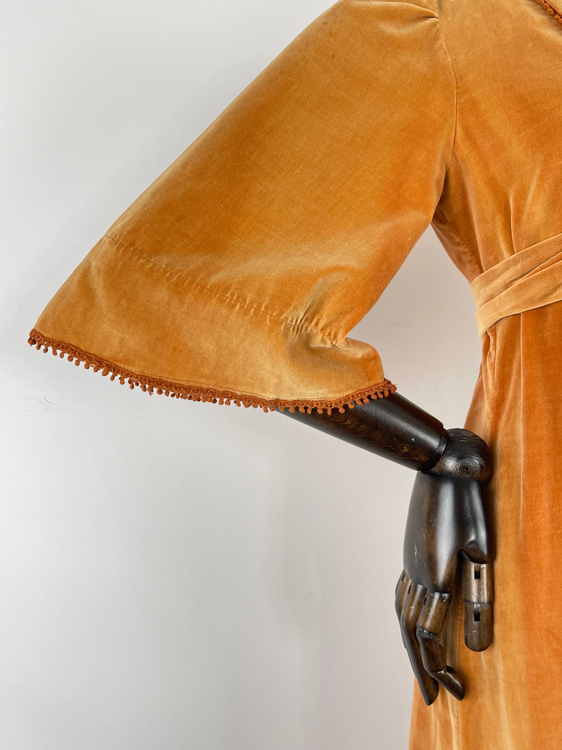 Condition: B, Good overall condition. As these original cotton/cotton velvet dresses are typically subject to, there is some colour difference over the dress, some parts are lighter than others and there is the odd tiny mark here and there. This is very much to be expected and really adds to its authenticity and charm. There is a small nibble of crochet detailing on the right hand side of the bust.