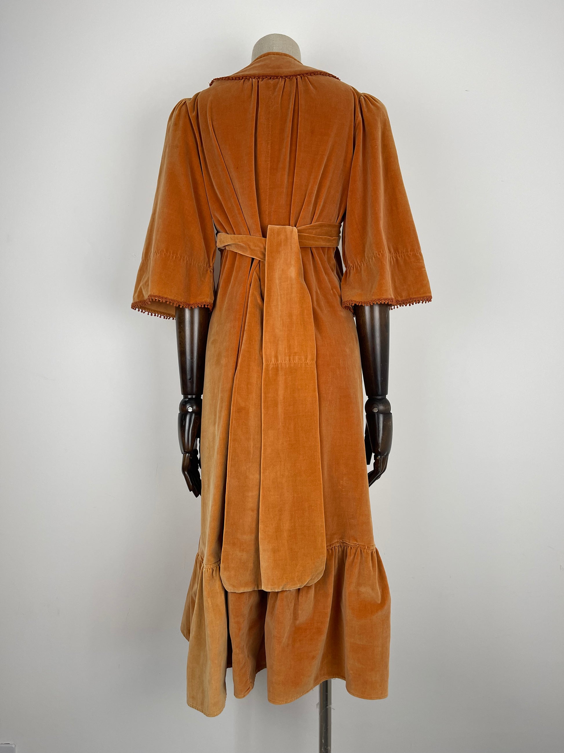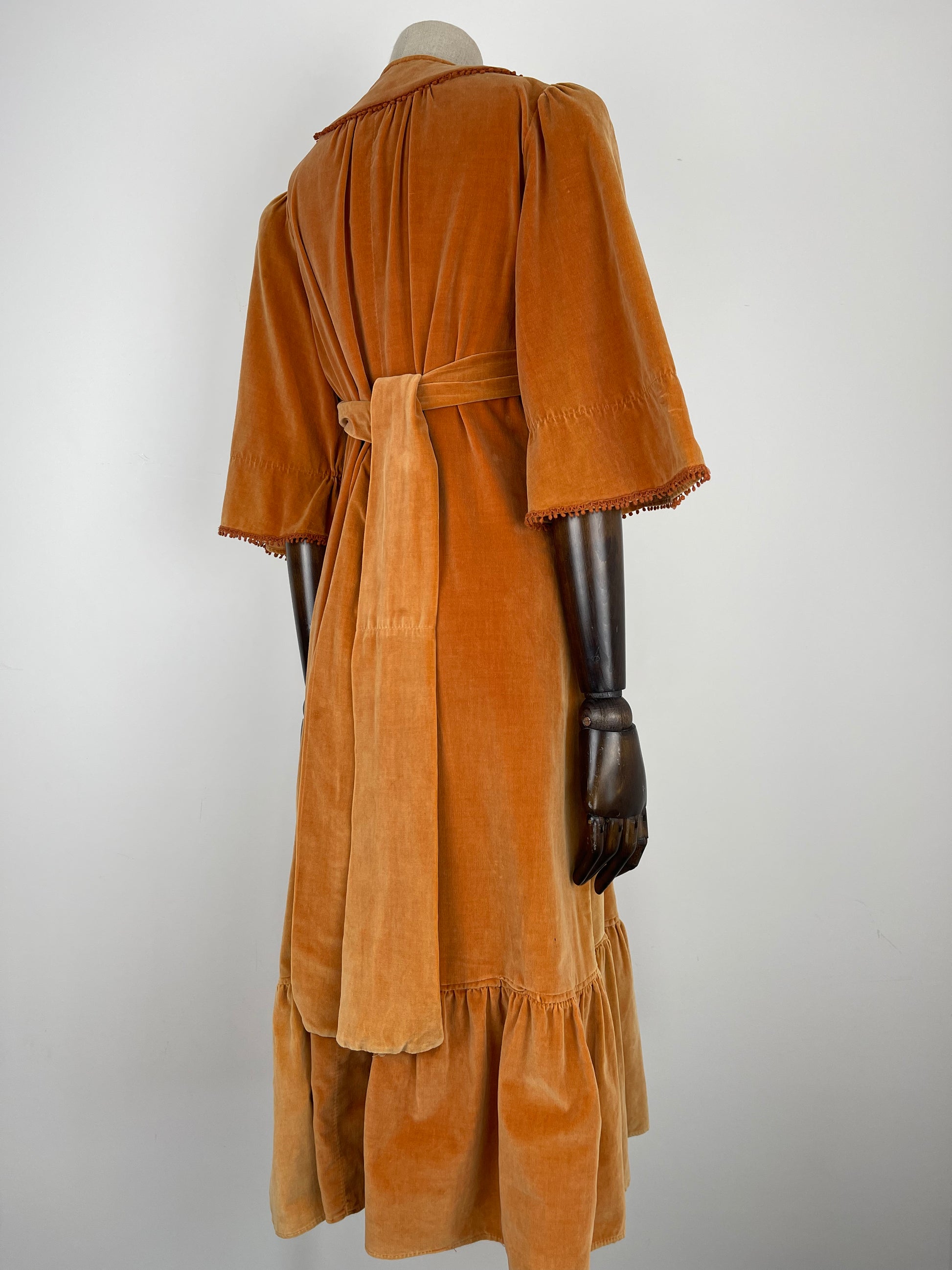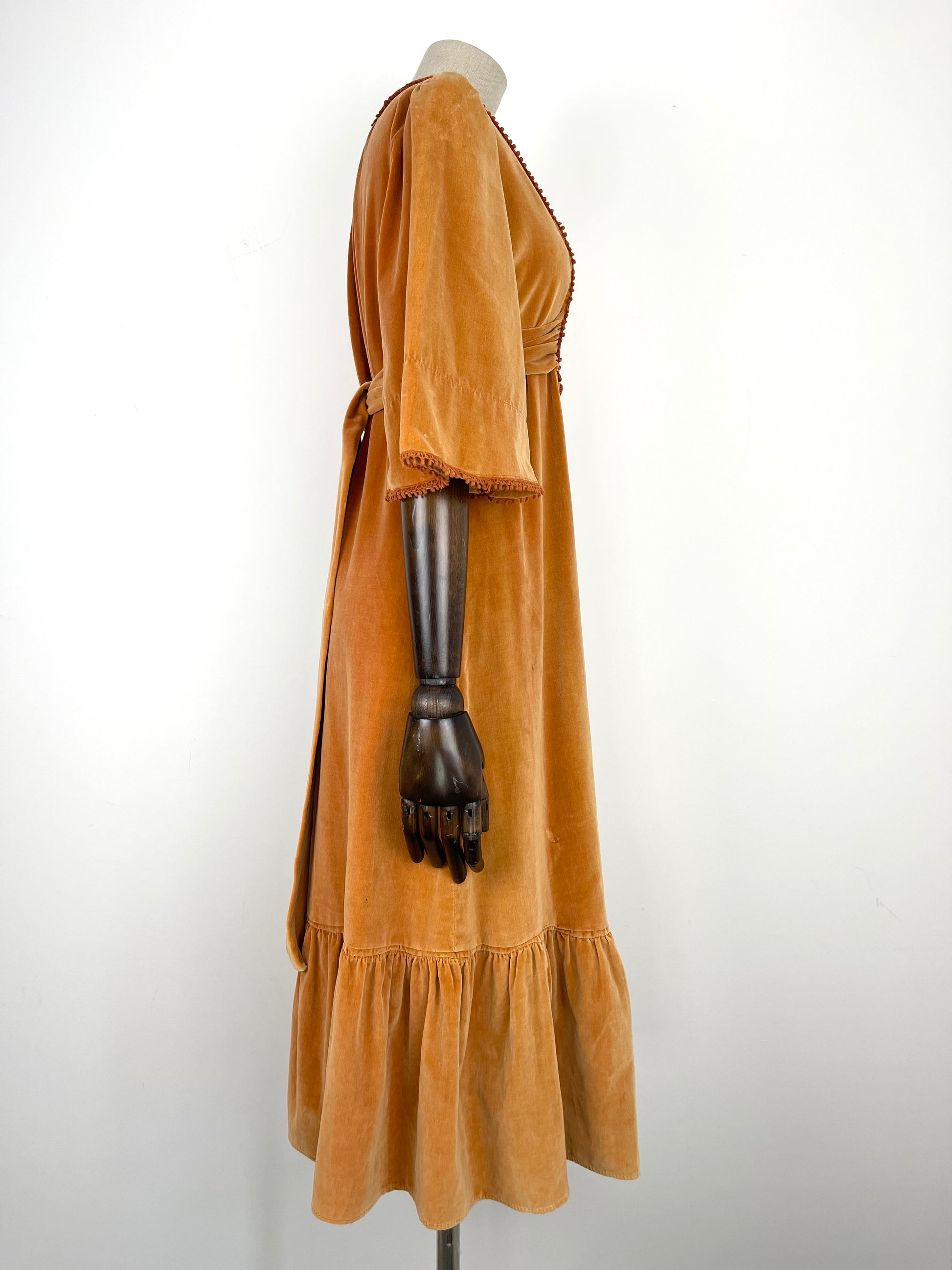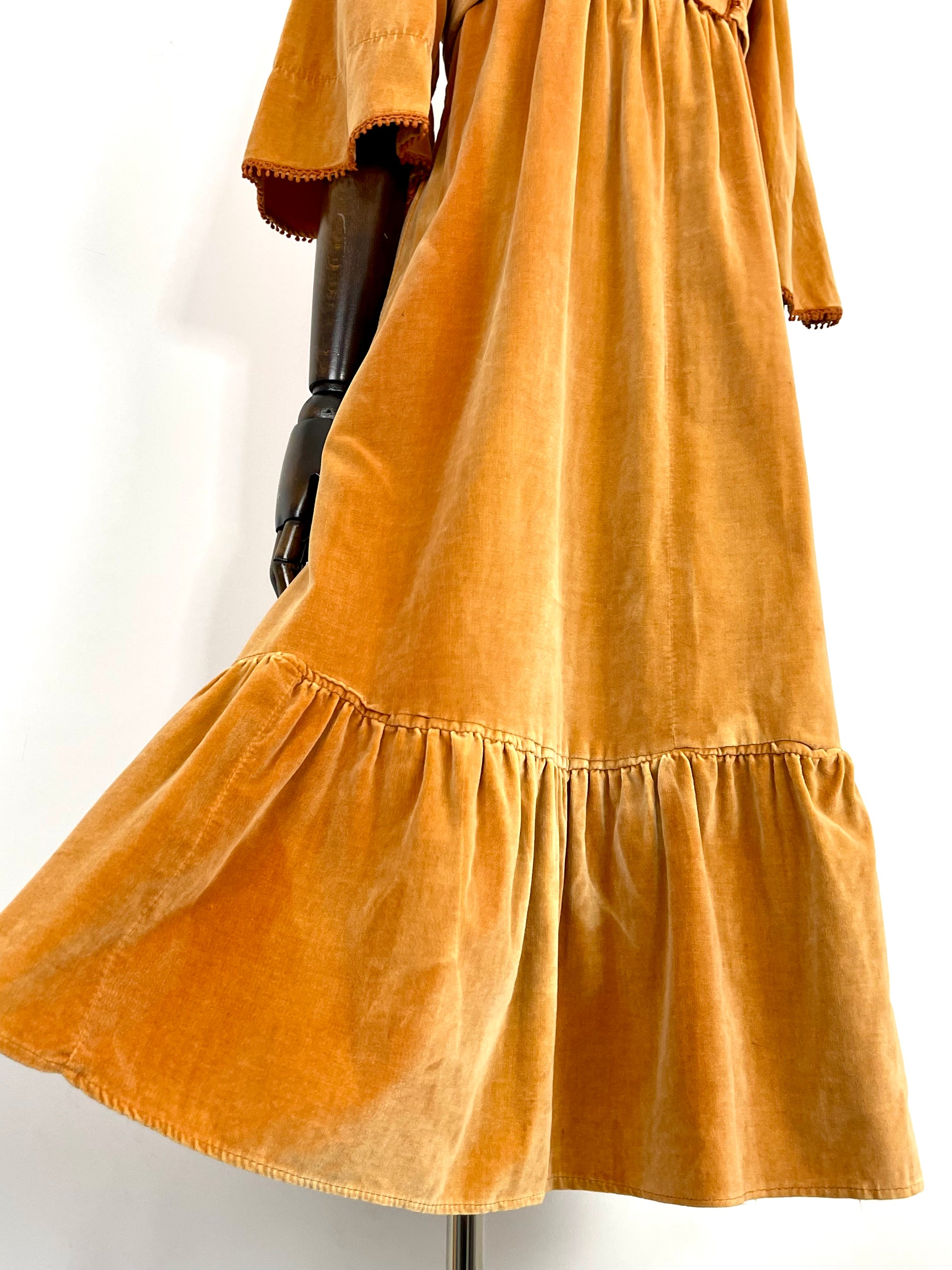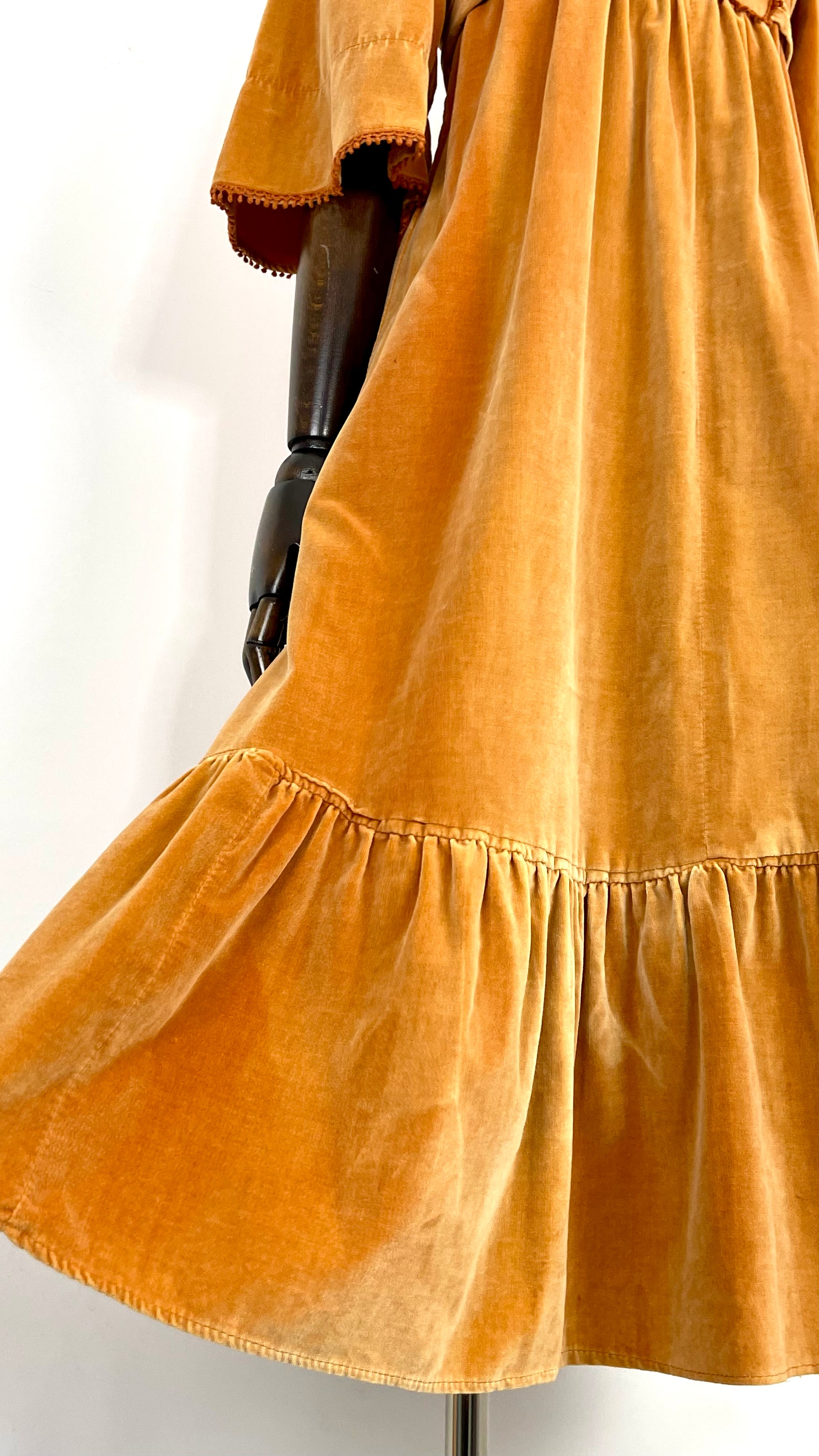 The very first piece of the SS23 collection is a true beauty and rarity. From the Iconic & collectible Earlybird label, soft peach/orange tone velvet drapes beautifully from an underbust waist tie giving a beautifully flattering silhouette whilst be very comfortable and wearable. Delicate deep orange crochet detailing frames the deep V bib style neckline and dances across the hems of the angel sleeves. Finished off with a deep ruffle hemline she is perfect for the transitional weather of spring.