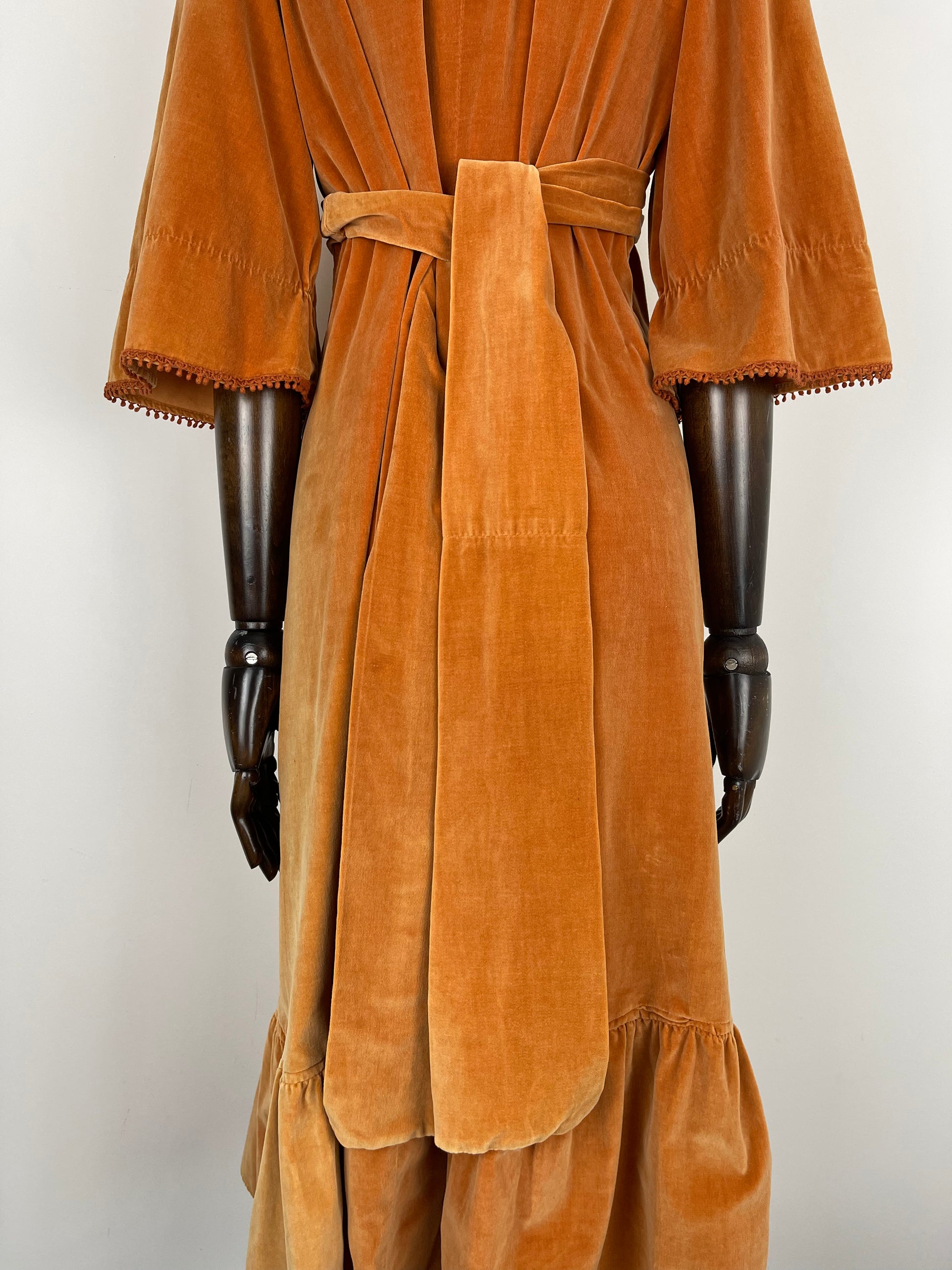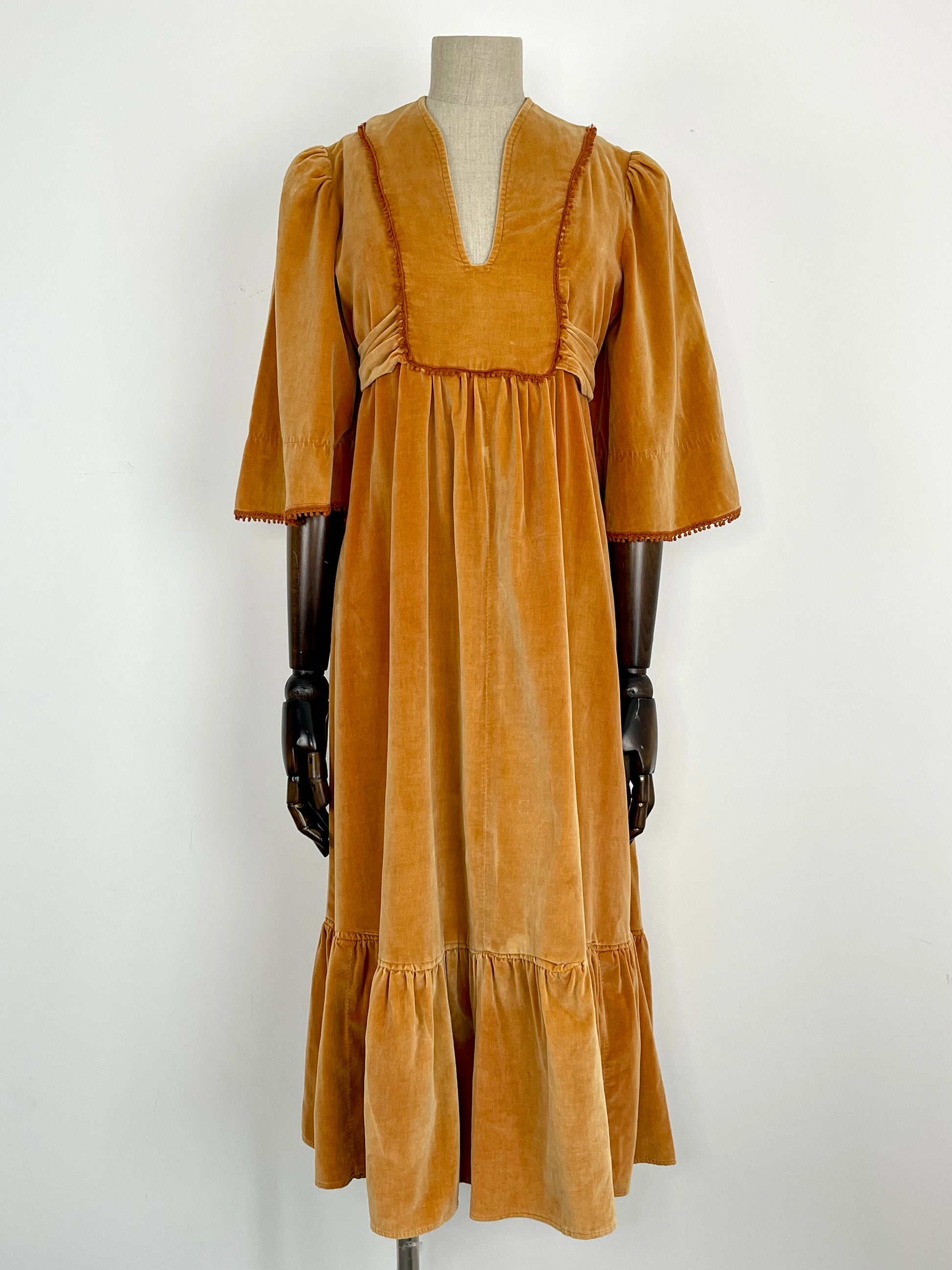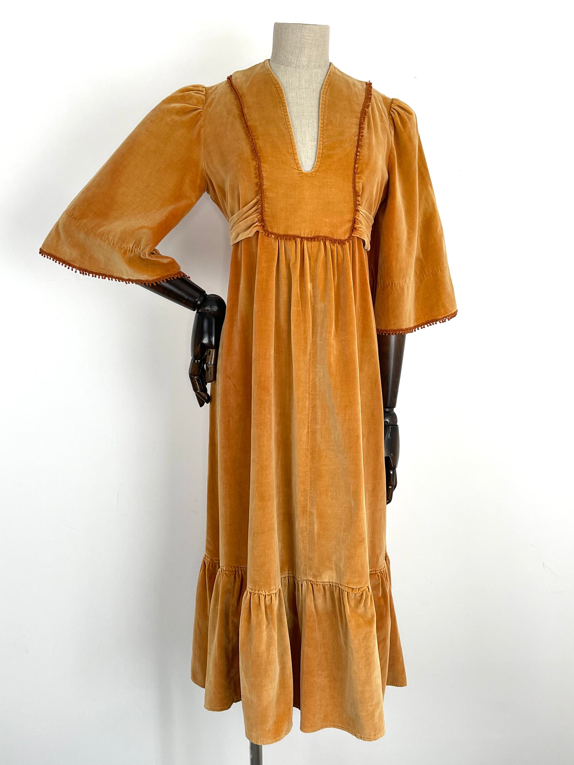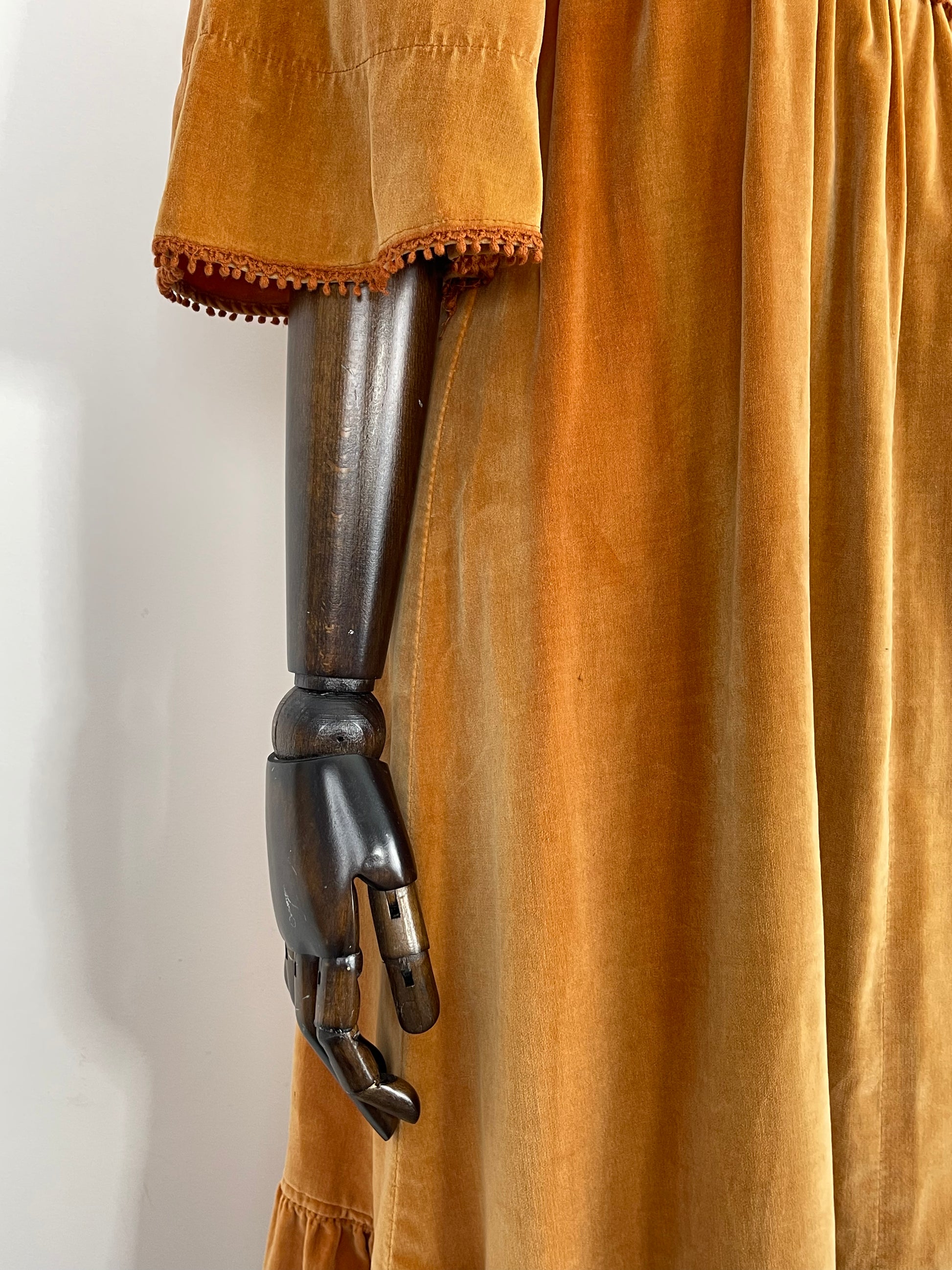 The very first piece of the SS23 collection is a true beauty and rarity. From the Iconic & collectible Earlybird label, soft peach/orange tone velvet drapes beautifully from an underbust waist tie giving a beautifully flattering silhouette whilst be very comfortable and wearable. Delicate deep orange crochet detailing frames the deep V bib style neckline and dances across the hems of the angel sleeves. Finished off with a deep ruffle hemline she is perfect for the transitional weather of spring.