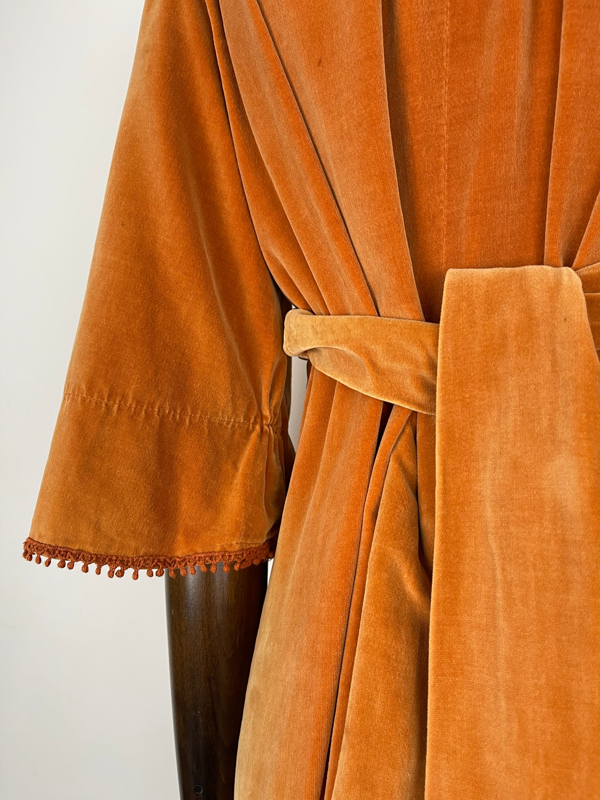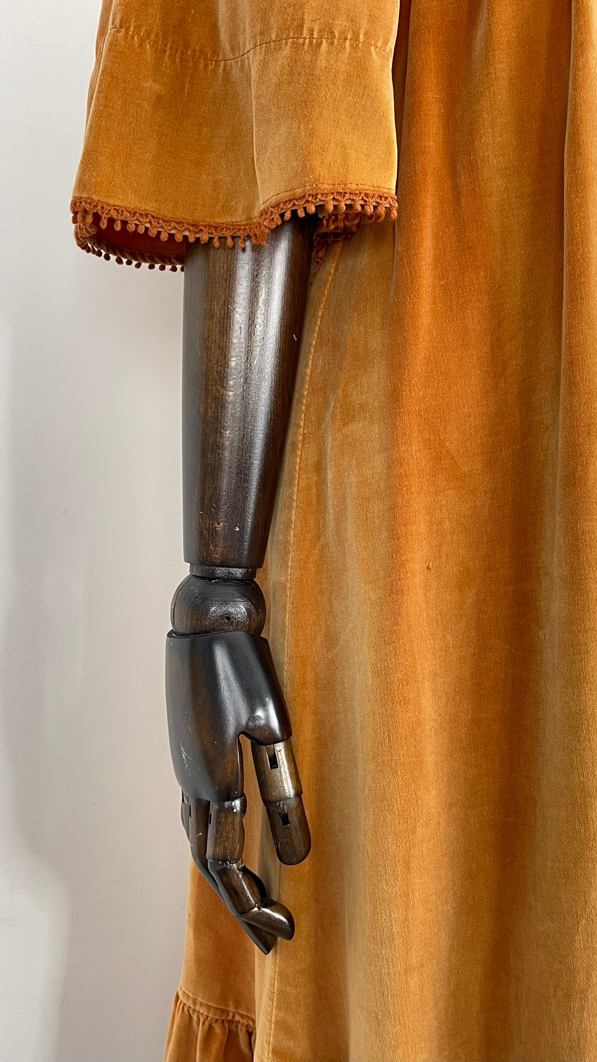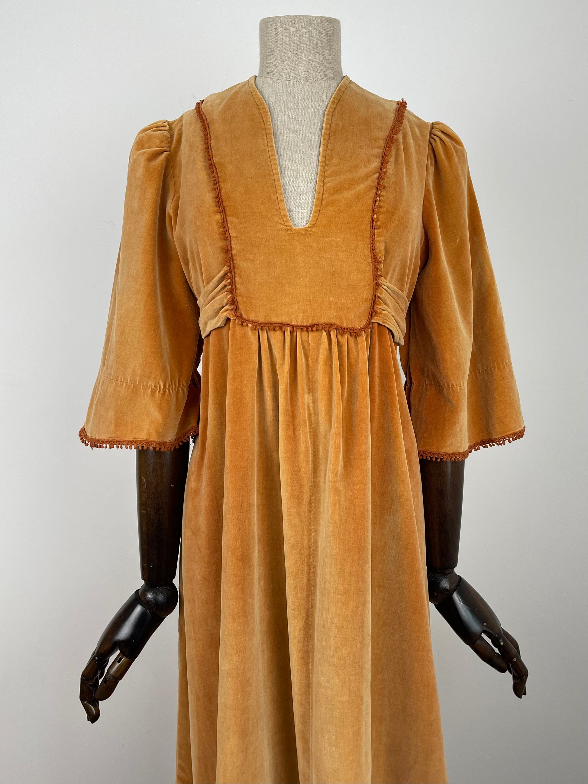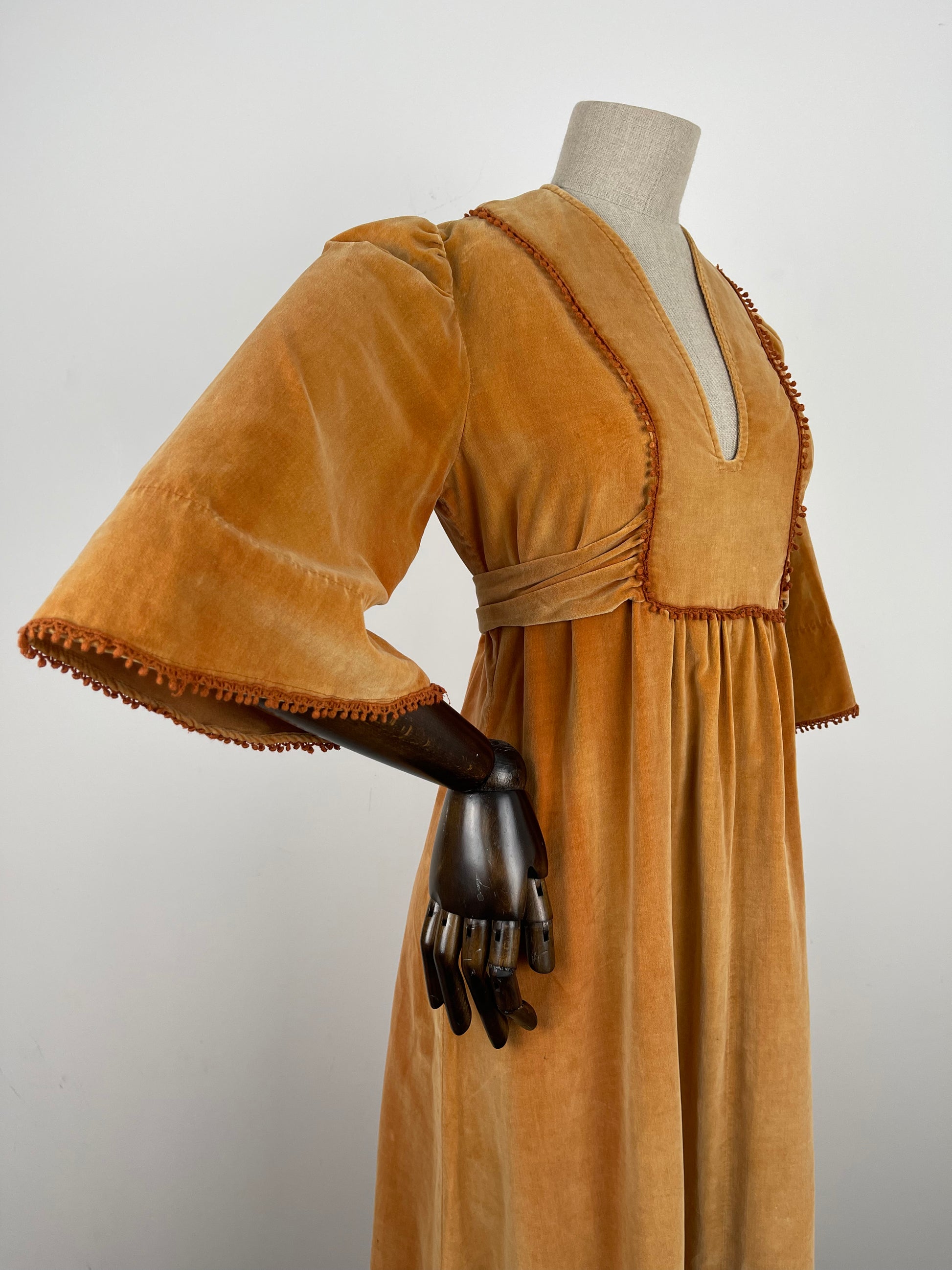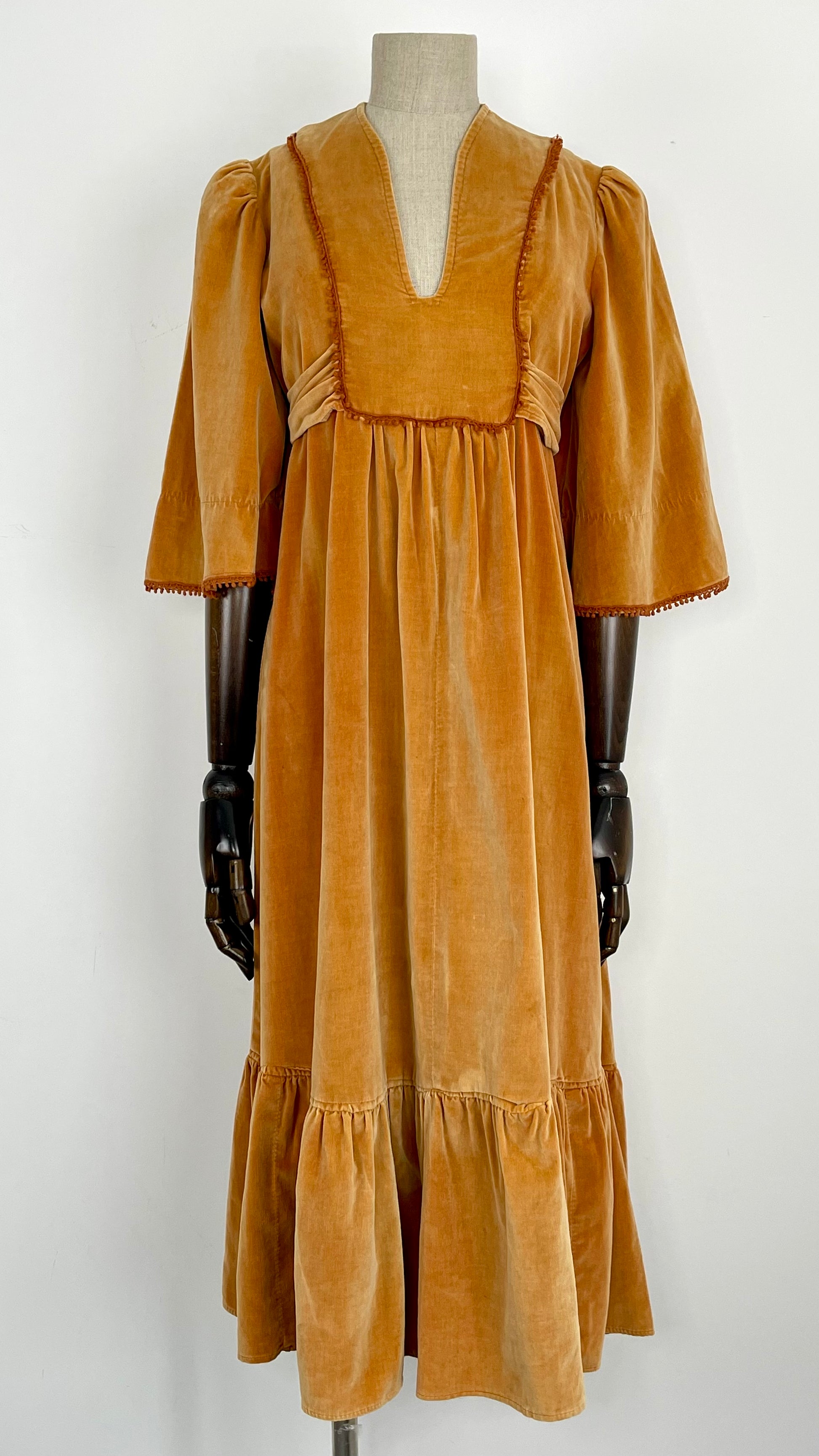 The very first piece of the SS23 collection is a true beauty and rarity. From the Iconic & collectible Earlybird label, soft peach/orange tone velvet drapes beautifully from an underbust waist tie giving a beautifully flattering silhouette whilst be very comfortable and wearable. Delicate deep orange crochet detailing frames the deep V bib style neckline and dances across the hems of the angel sleeves. Finished off with a deep ruffle hemline she is perfect for the transitional weather of spring.