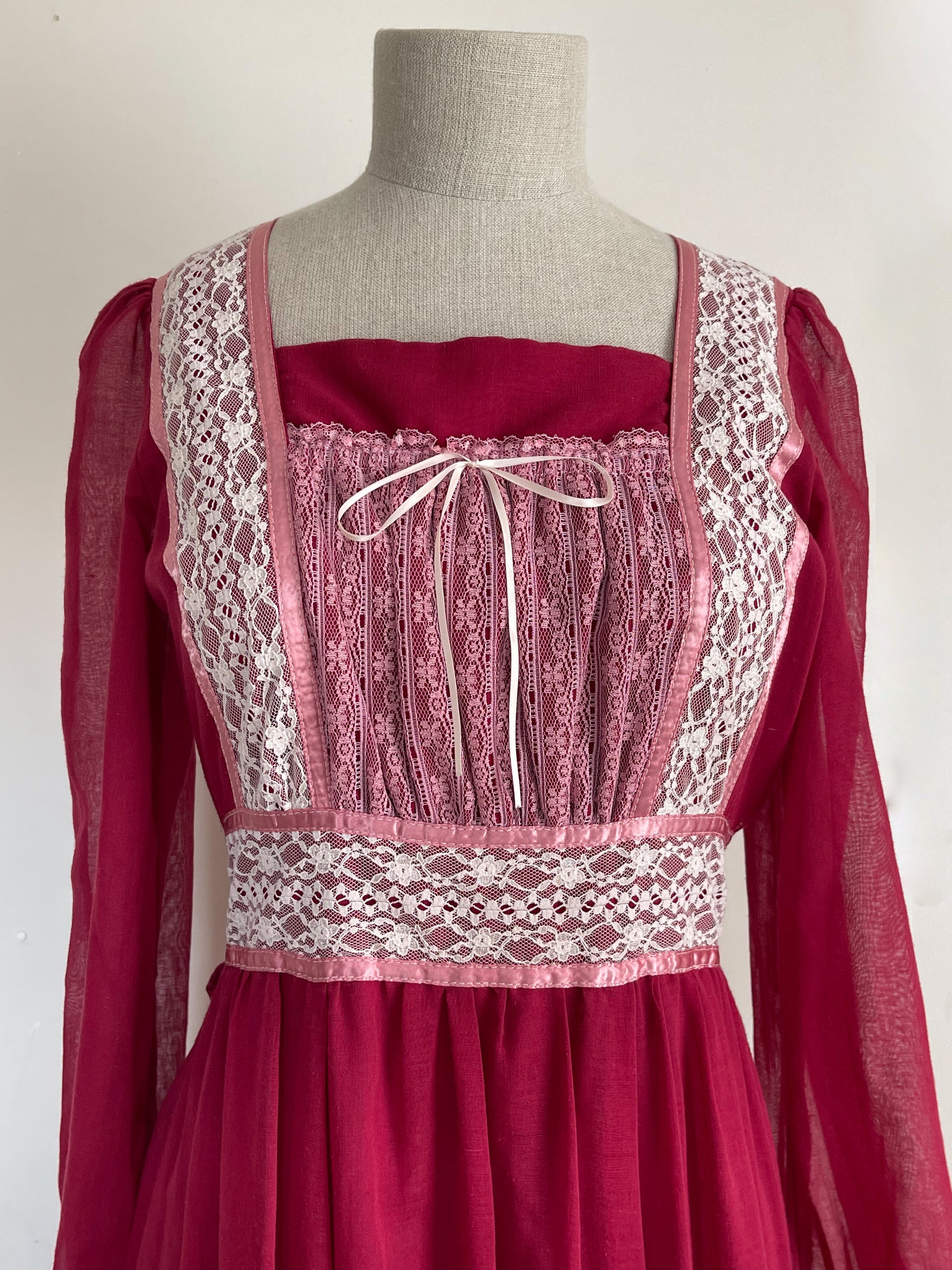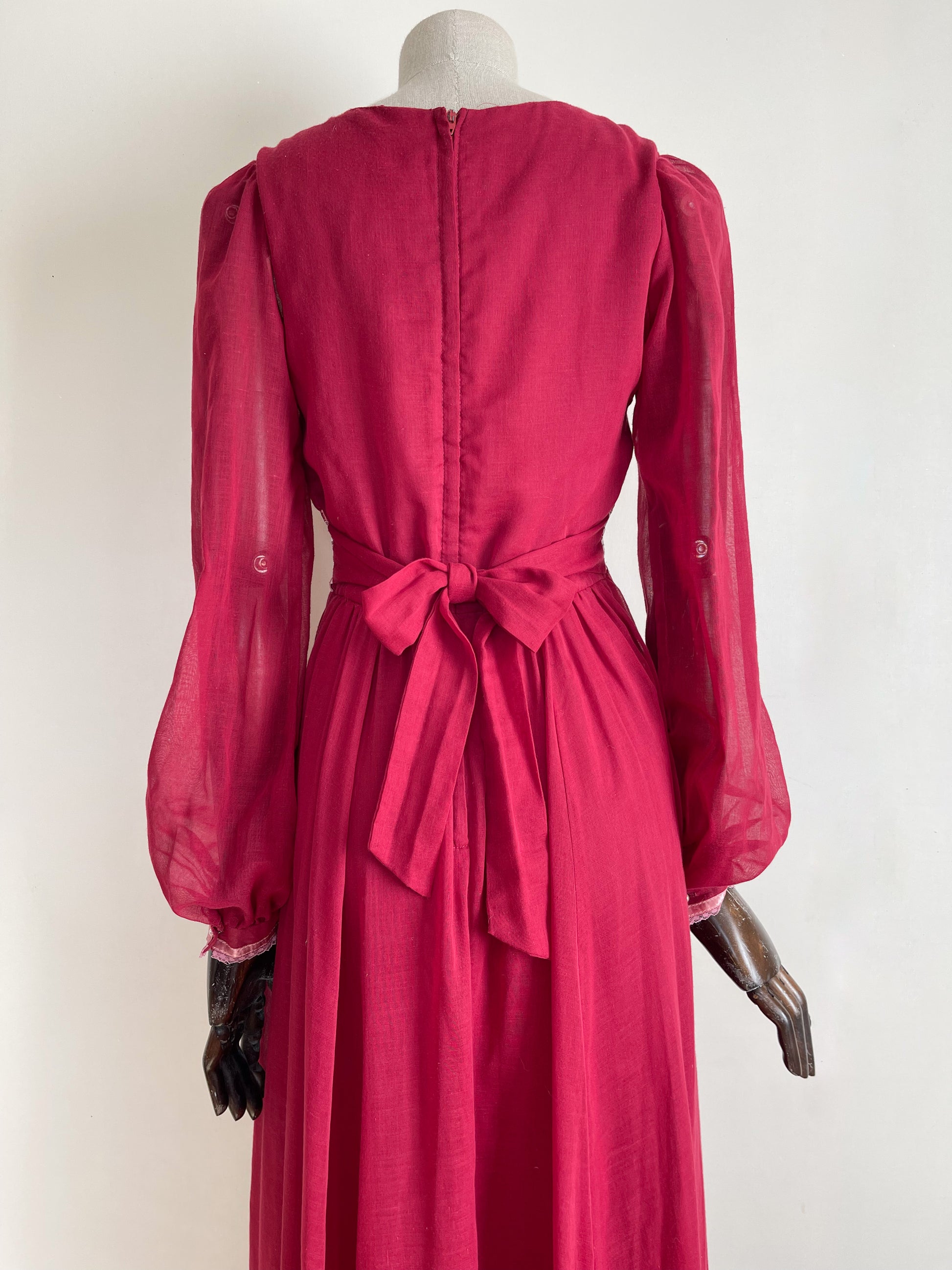 Rich ruby red lightweight cotton with square neckline, gathered bust, lace panelling, puffed sleeves and sweeping full skirt with ruffle hemline. Cinching waist tie which ties in a bow at the back creating more beautiful details. This amazing dress holds to all the right places and skims elegantly.