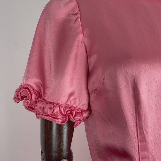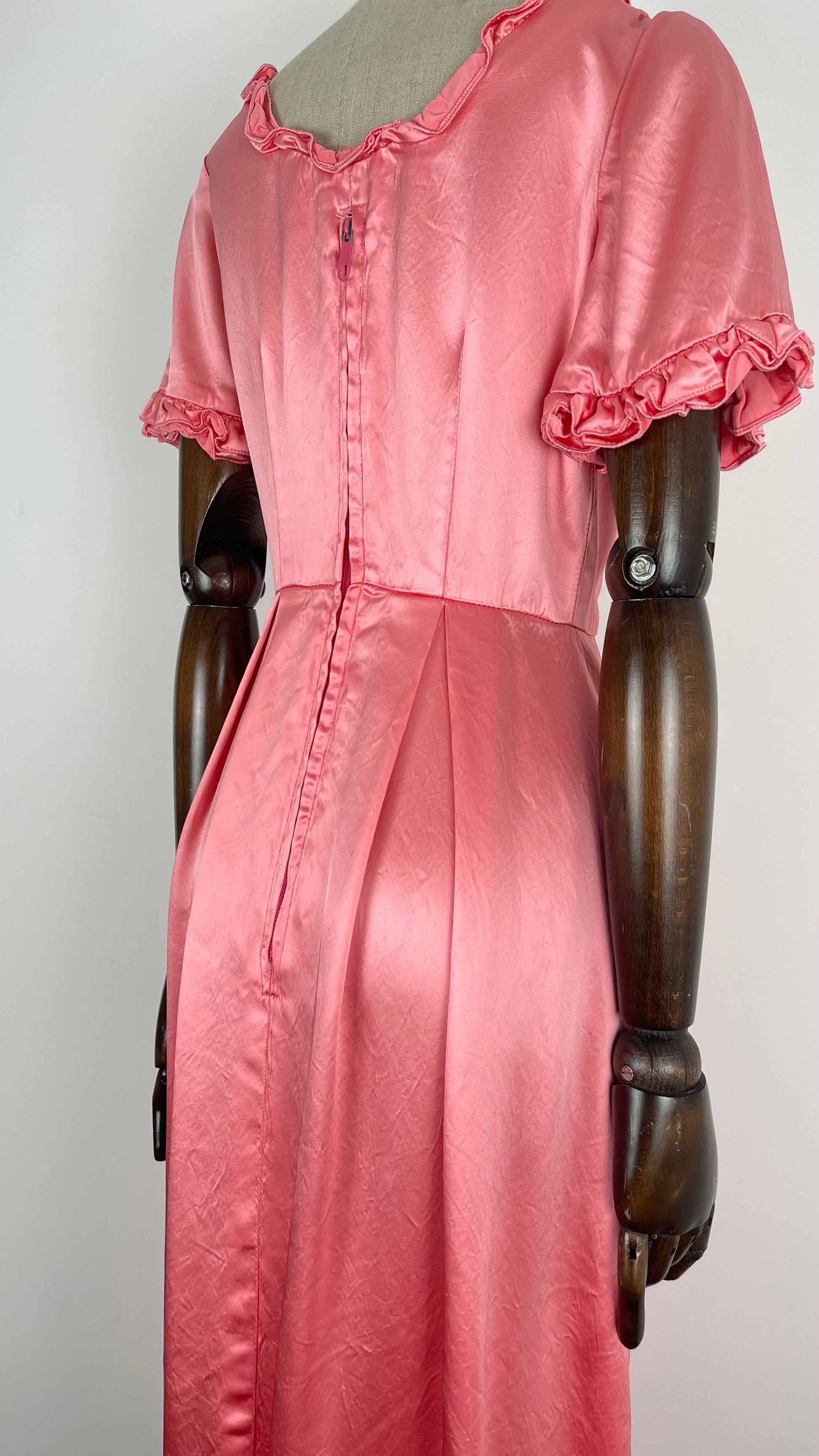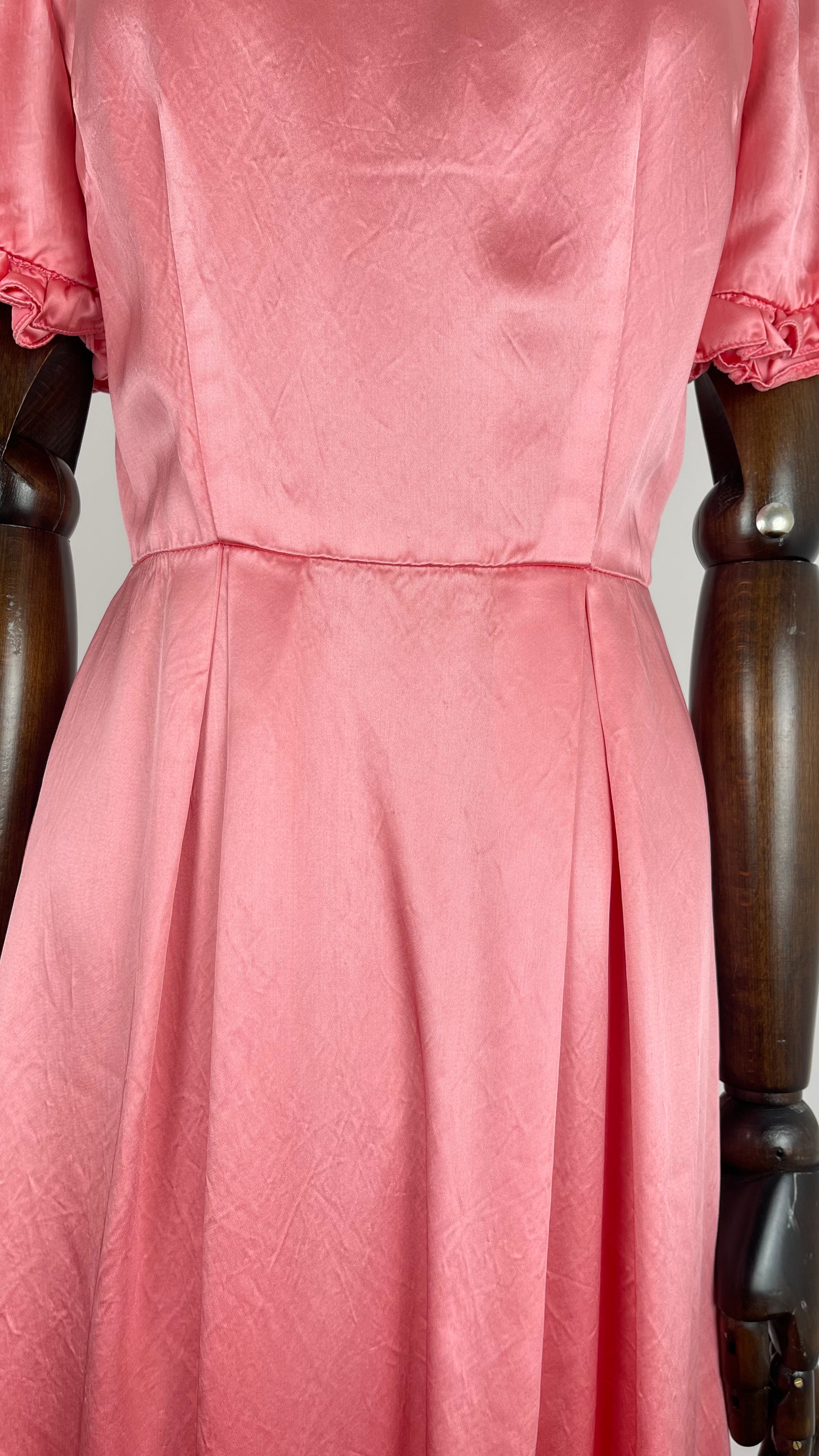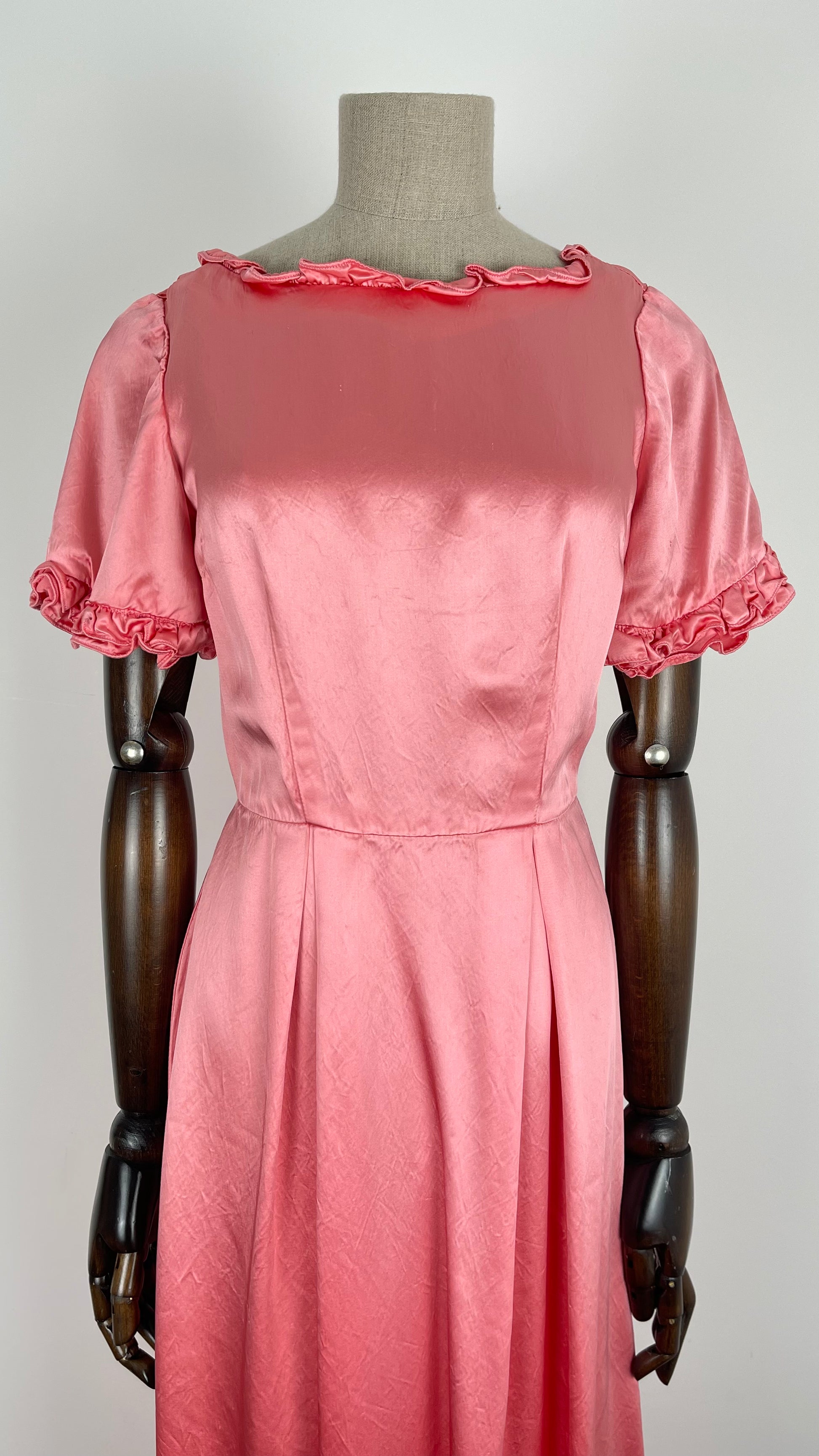 Liquid satin rose pink has been expertly tailored into this beautiful dress. Framed with understated ruffles on the neckline and sleeves and fitted to the waist, this is very flattering. Perfect for evenings and events, this really is a summers take on occasion wear. Pair with statement cocktail jewellery and kitten heels for an elegant and elevated look.