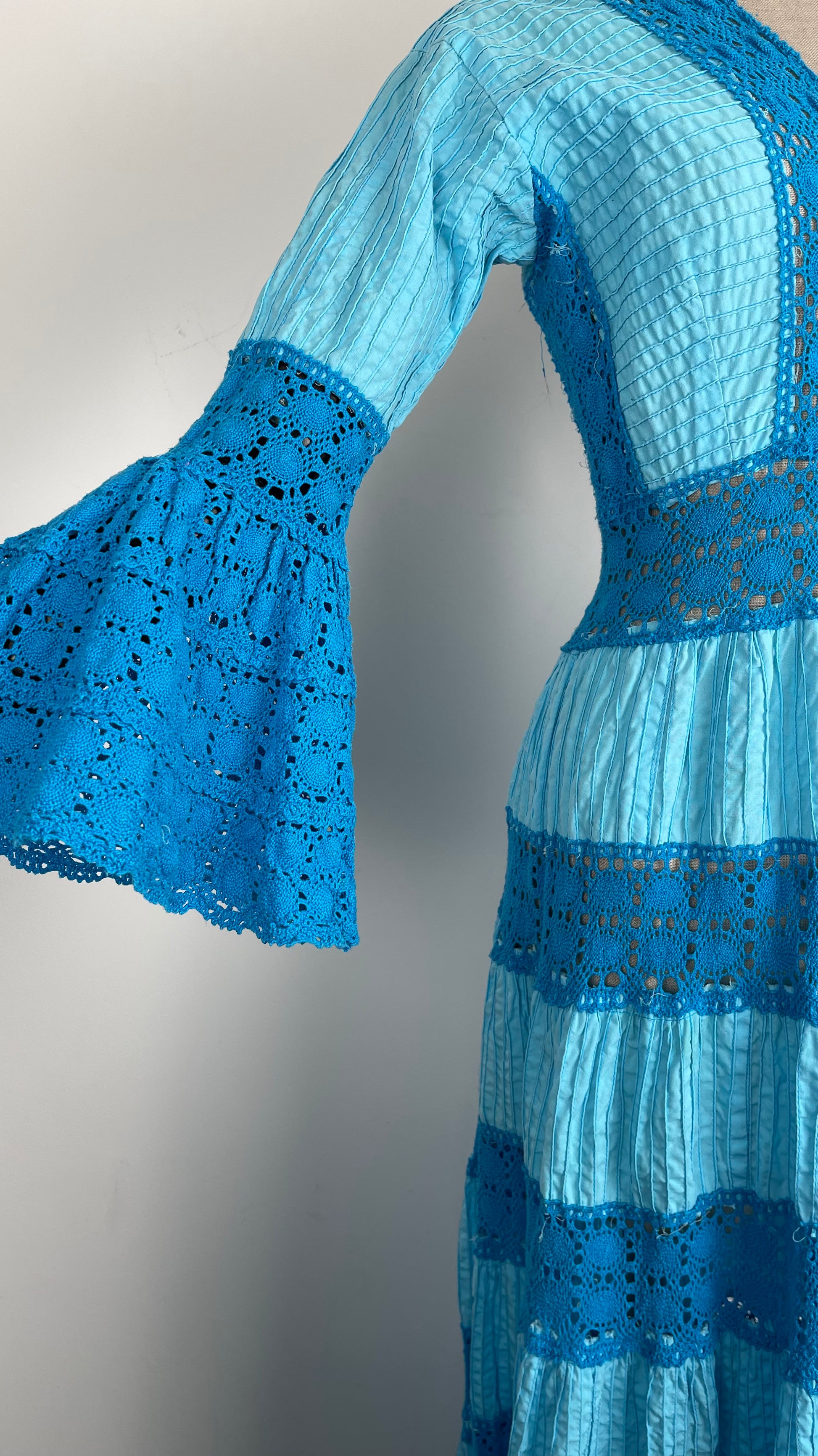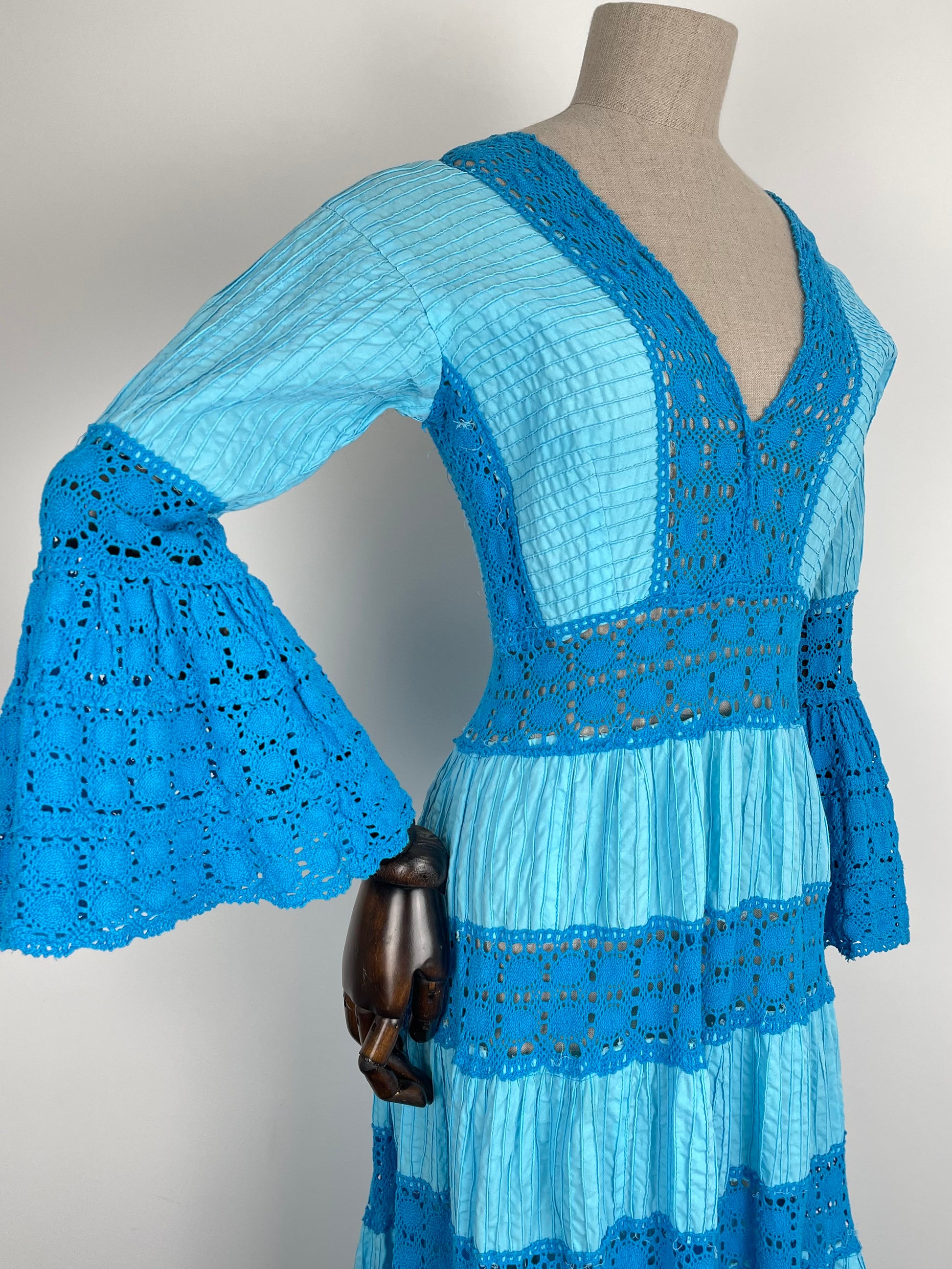 This beautiful original 1970s Mexican lace dress is a true rarity. In the most breathtaking shade of turquoise, cotton panels are tiered with hand crocheted panelling and elegant angel flared sleeves.
