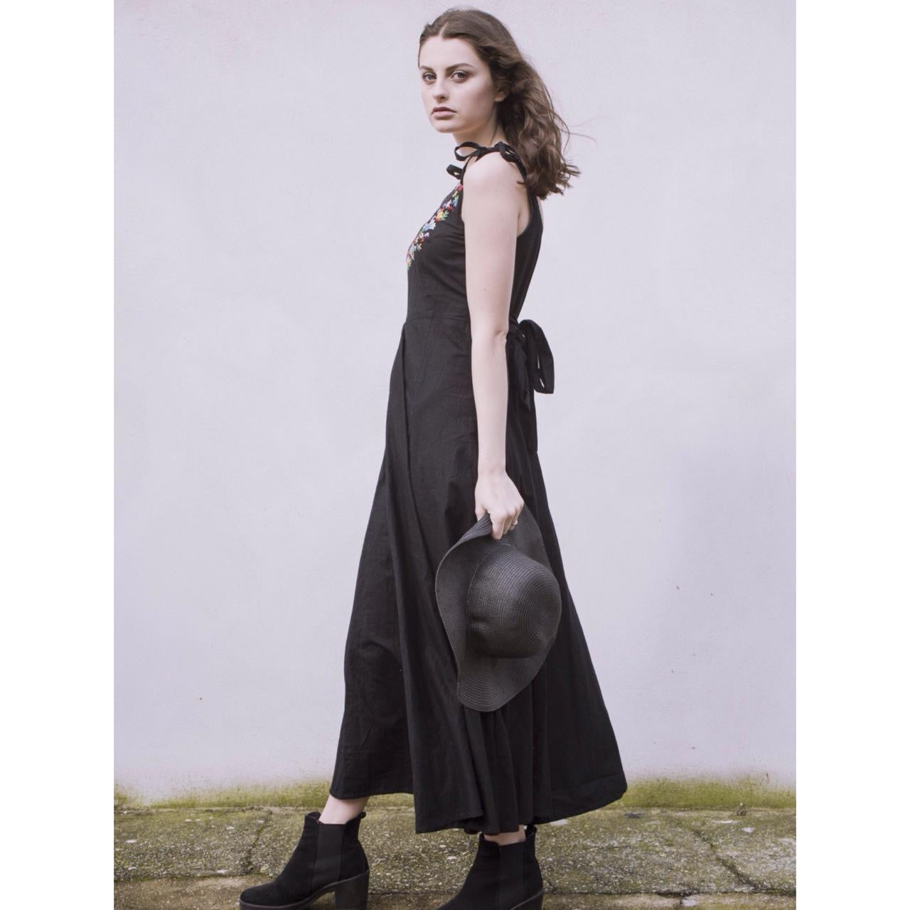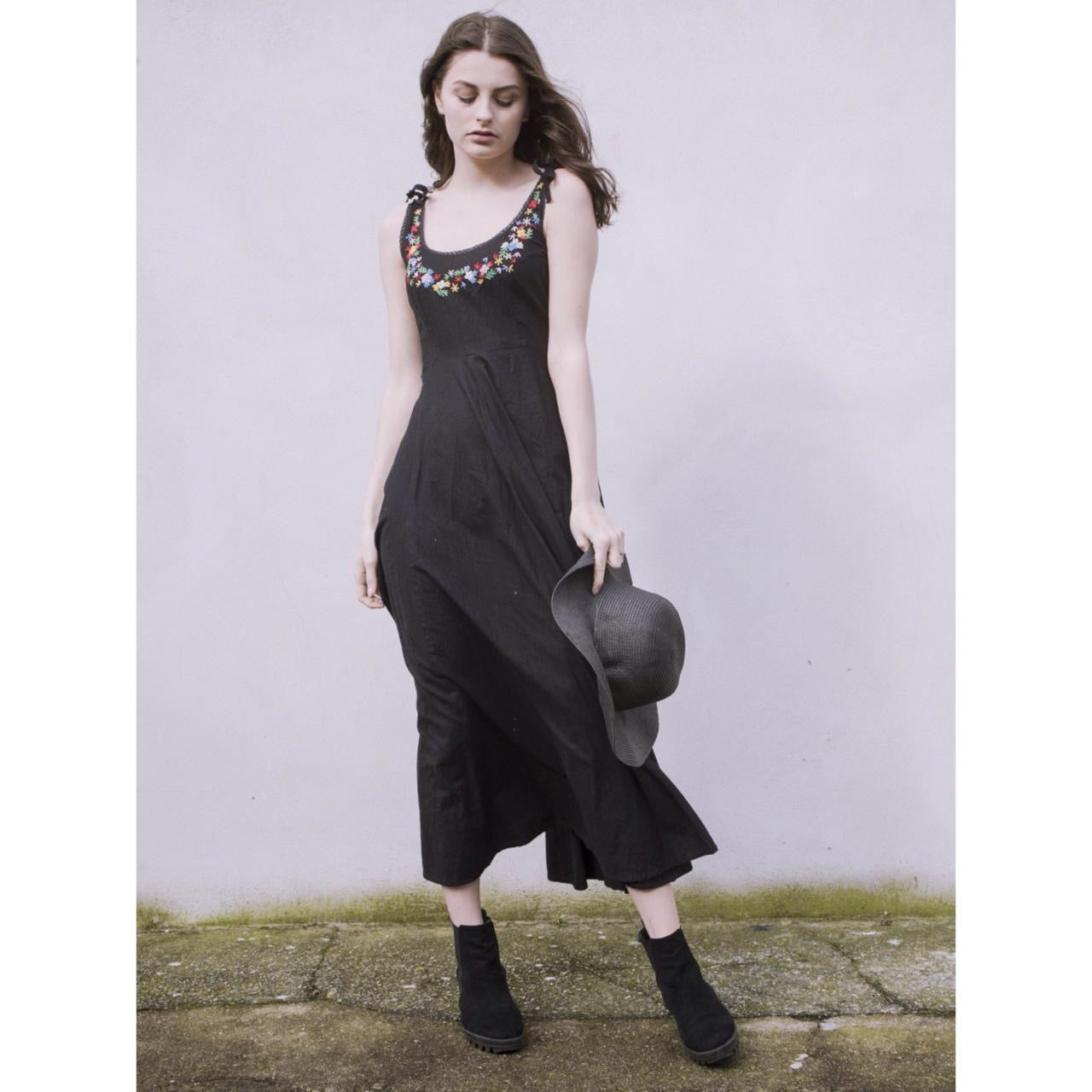 Vintage 1970s original black cotton dress with floral embroidery, shoulder & waist ties. Suits size small // uk8-10 - Measured from top centre to bottom hem approx 42 inches in length. Waist approx 28 inches (uk12) waist can be tied to suit your size. Good vintage condition - Sent first class signed for with prompt dispatch, international orders welcome.