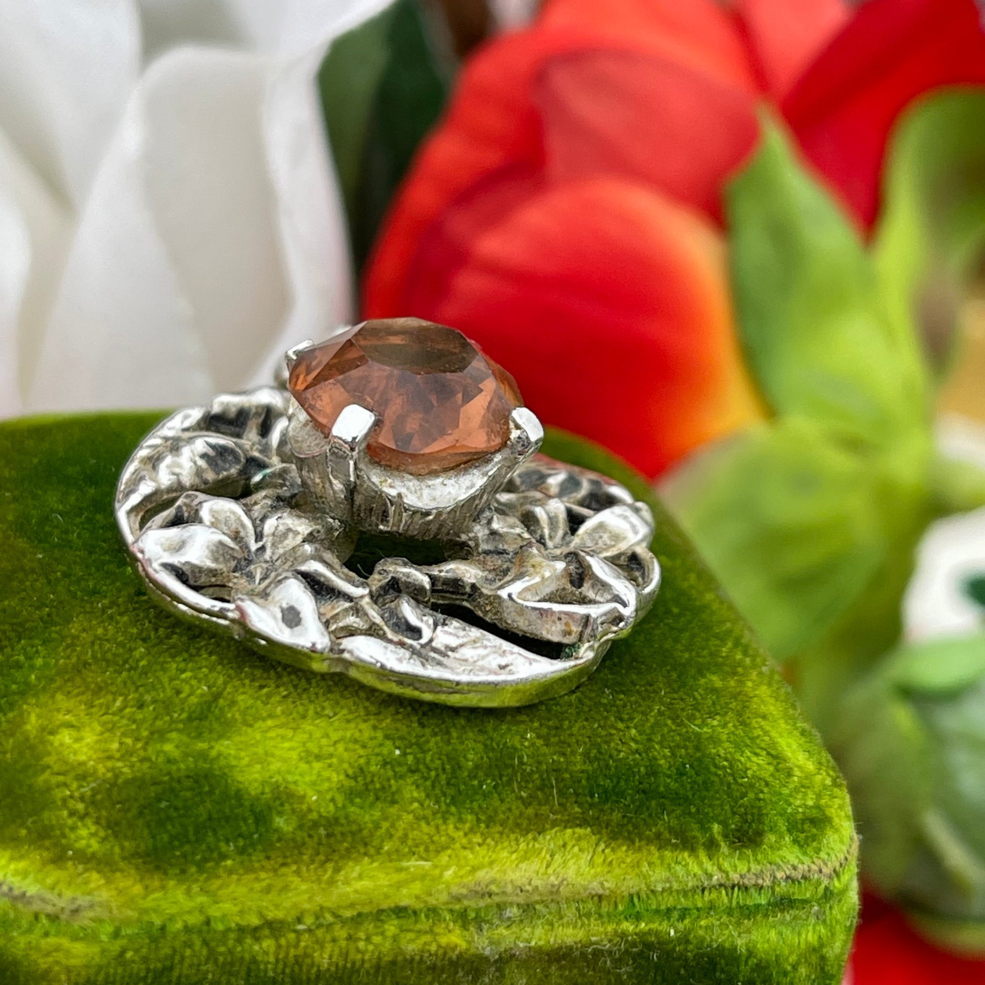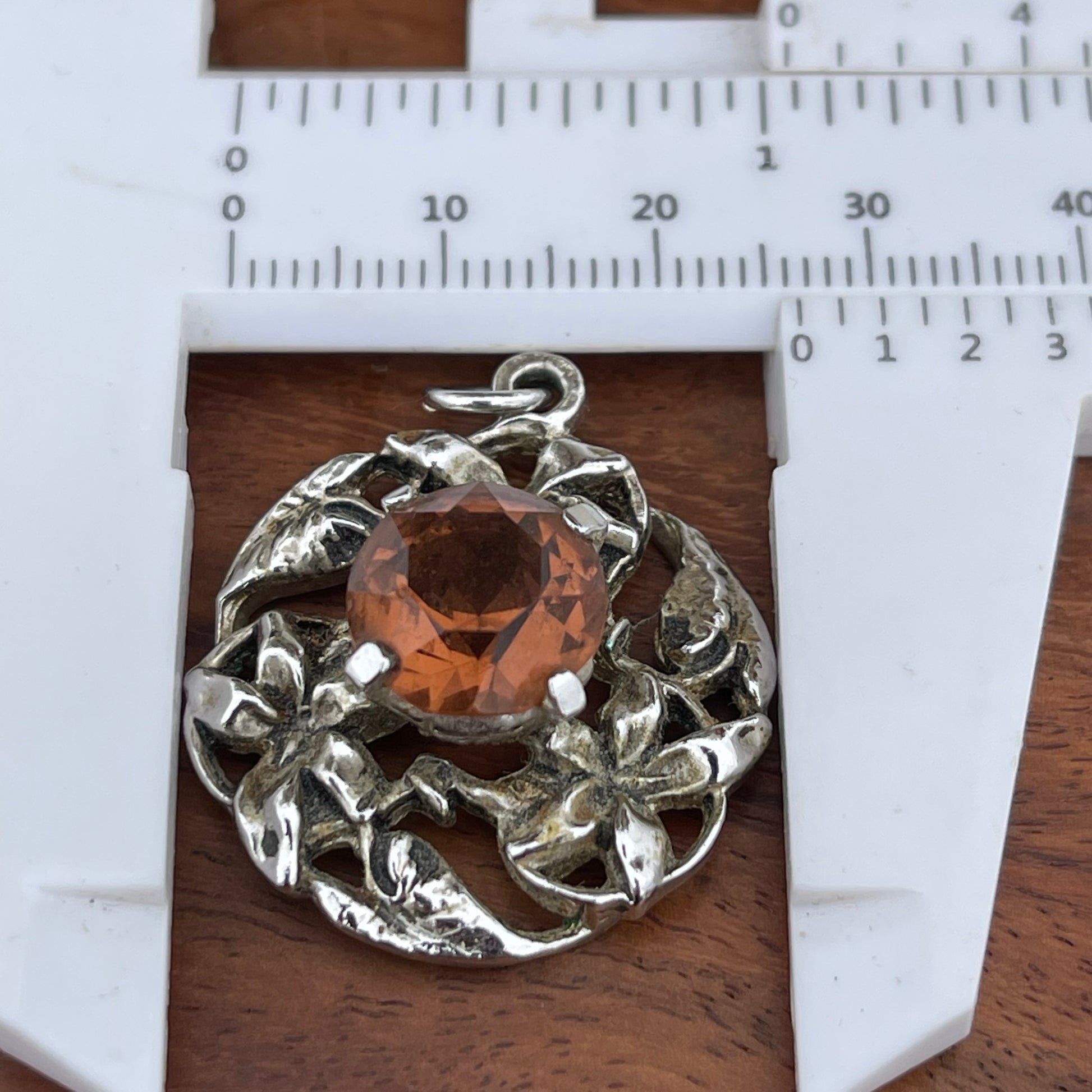 Vintage Art Nouveau Style Silver Tone Citrine Orange Glass Pendant. Floral openwork design and setting for a fiery orange stone centre.