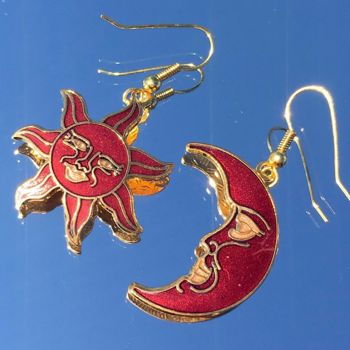 Vintage Red Cloisonné Celestial Sun and Moon earrings