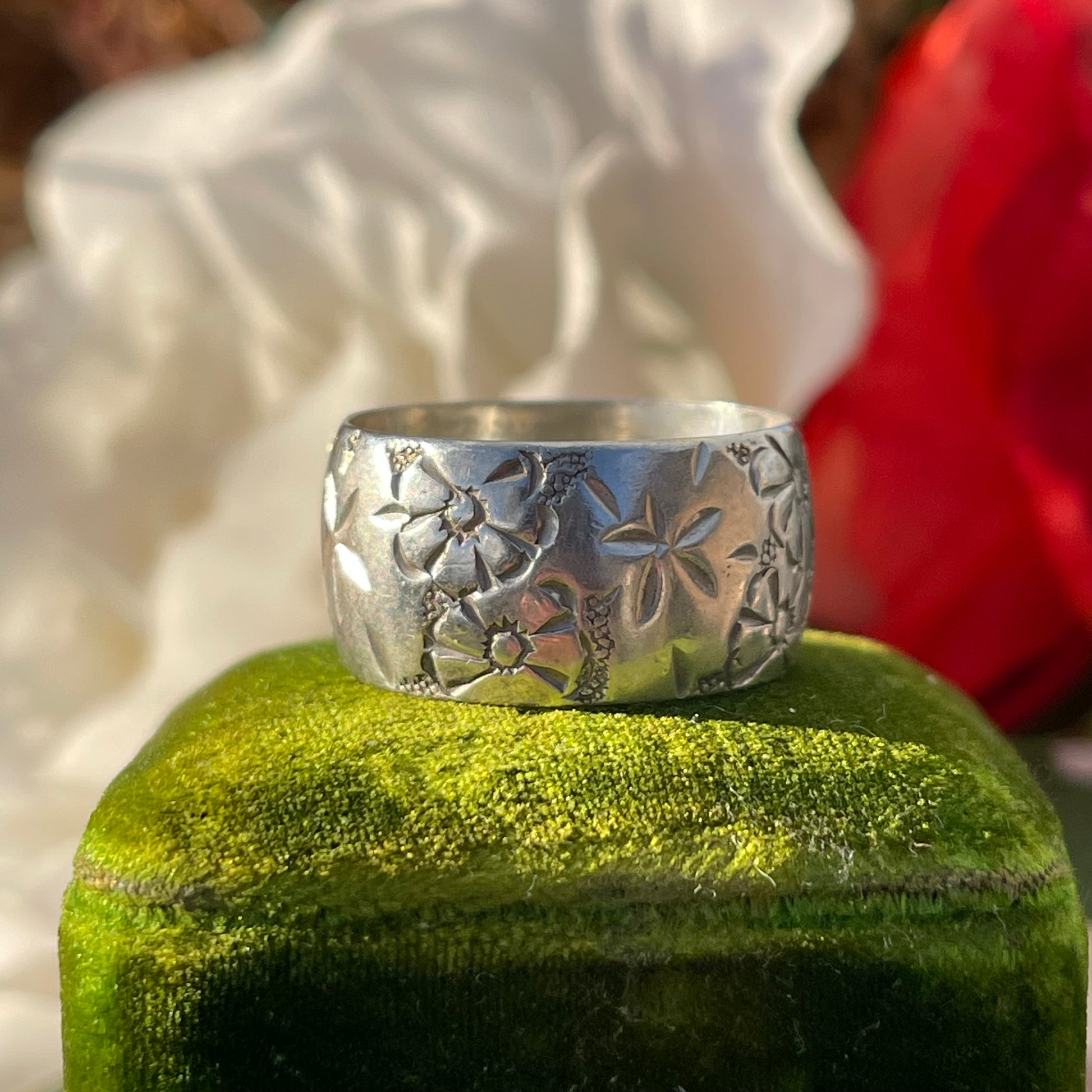 Vintage thick statement band ring with intricate floral and star etching detail,