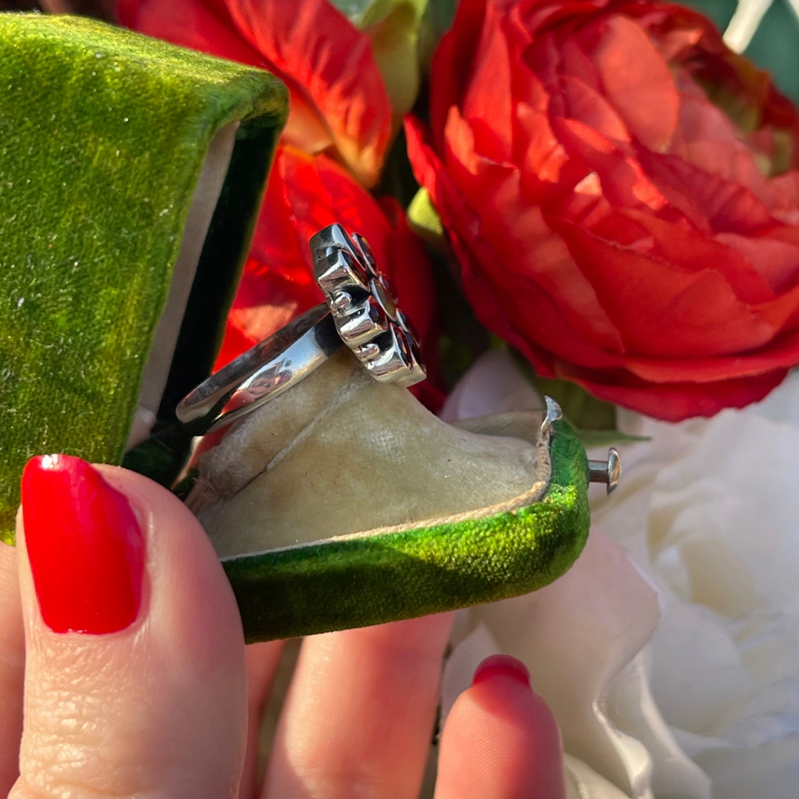 Vintage sterling silver Indian gem stone flower ring with garnets petals and golden citrine centre