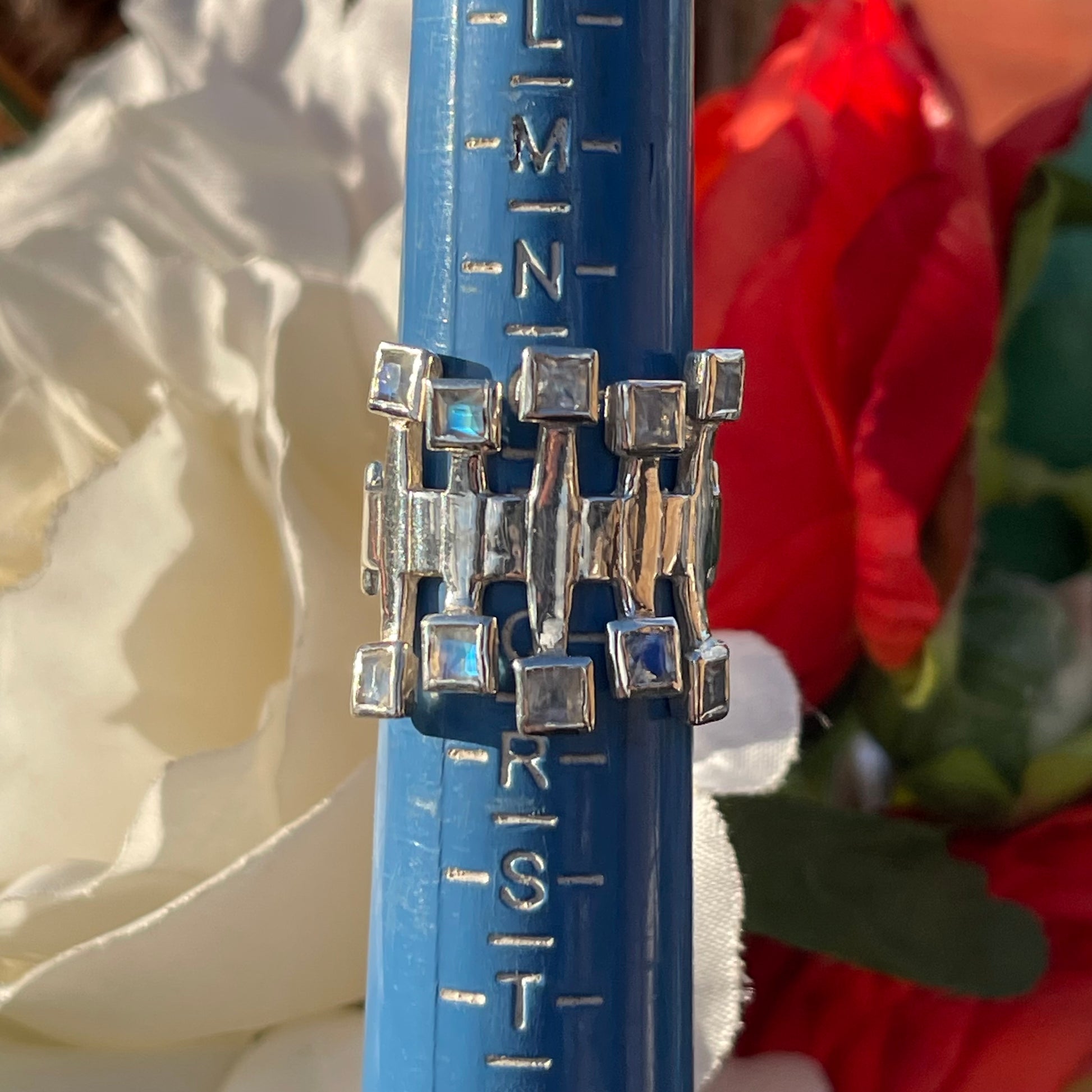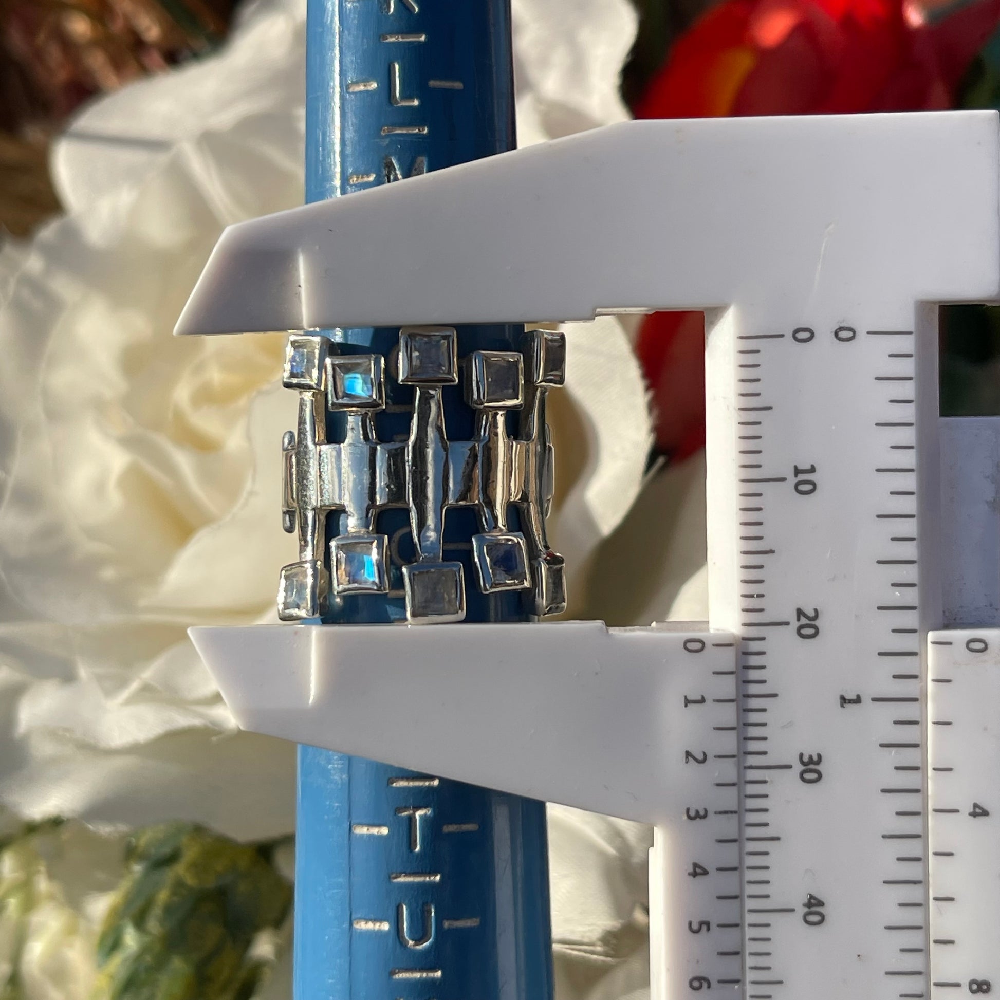 Vintage large sterling silver modernist style ring with striking blue flashing moonstones