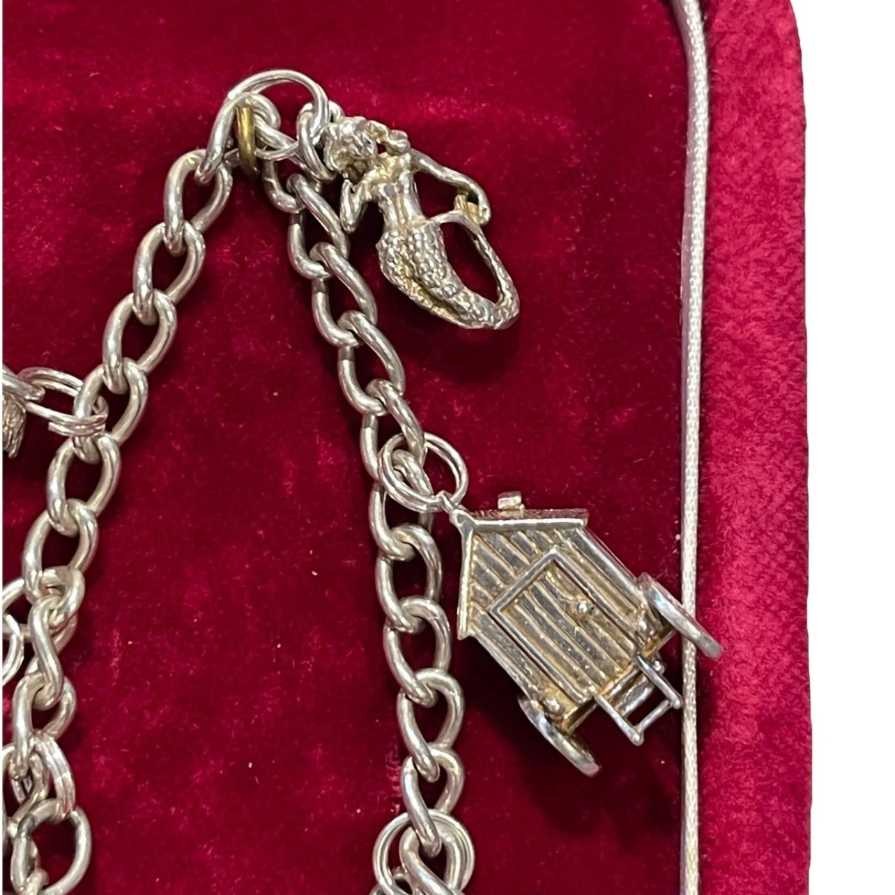RARE Vintage Sterling Silver Ocean Theme Charm Bracelet featuring an array of seaside ocean themed charms including: mermaid riding seahorse, articulated bathing hut that opens to a lady, shells, seahorse with pearl bead, palm tree
