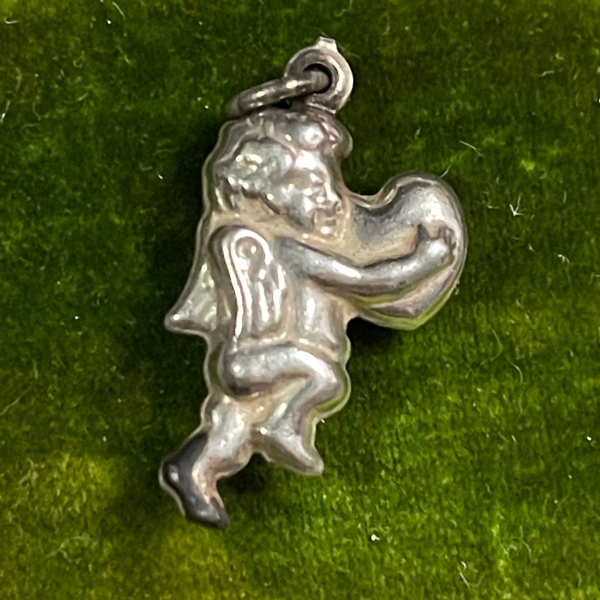 A vintage sterling silver puffy cherub heart charm. Can be worn as a pendant or affixed to a bracelet as a charm.