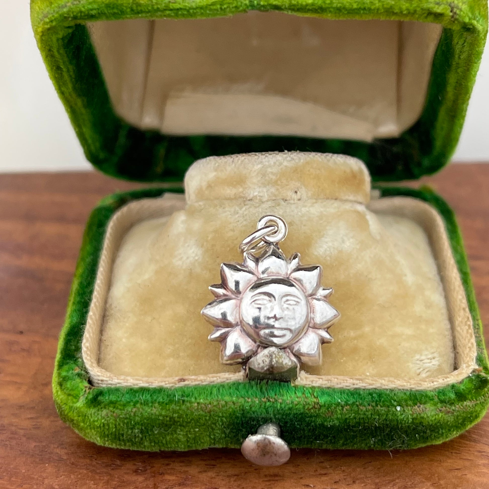 A vintage sterling silver puffy sun charm. Can be worn as a pendant or affixed to a bracelet as a charm.